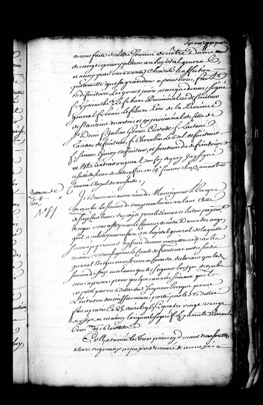 Quittance partielle de monseigneur le Comte de Frontenac, syndic des Pères Récollets, en faveur de monseigneur de Saint-Vallier pour le paiement du prix des terres et du couvent de Notre-Dame-des-Anges, achetés aux Récollets selon le contrat de vente passé le 13 septembre 1692 devant François Genaple de Bellefonds, 25 avril 1697, Archives nationales à Québec, Fonds Intendants, (03Q,E1,S4,SS1,D161,P15).