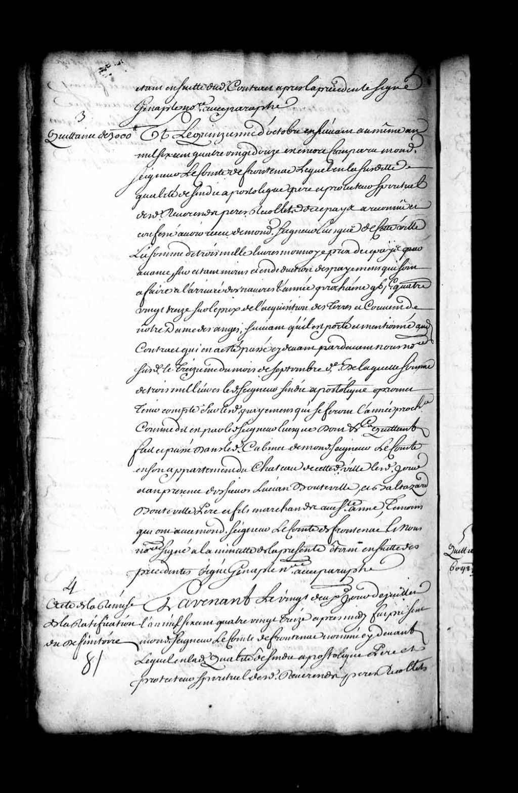 Quittance partielle de monseigneur de Frontenac, syndic des Pères Récollets, en faveur de monseigneur de Saint-Vallier pour le paiement du prix des terres et du couvent de Notre-Dame-des-Anges, achetés aux Récollets selon le contrat de vente passé le 13 septembre 1692 devant François Genaple de Bellefonds (Notaire François Genaple de Bellefonds)