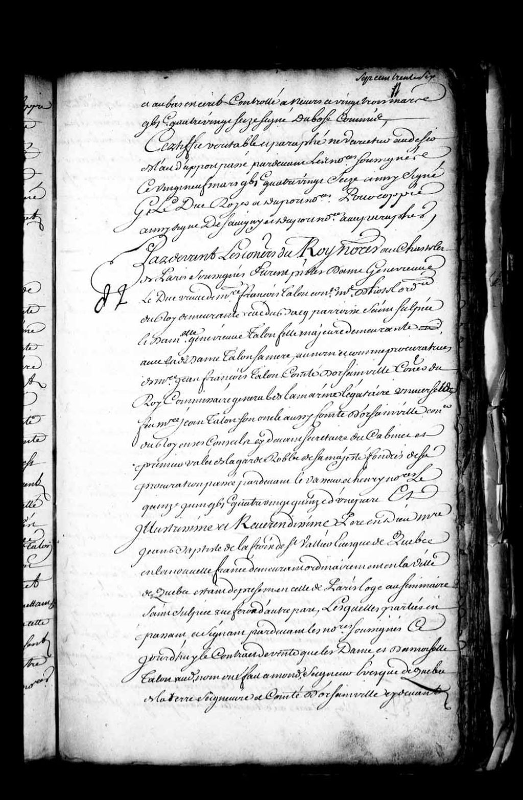 Acte d'accord et conditions entre dame Geneviève LeDuc, veuve de Maître François Talon, conseiller, maître ordinaire du Roi, demeurant en la paroisse Saint-Sulpice à Paris, et damoiselle Geneviève Talon, sa fille, procureure de Maître Jean-François Talon, comte d'Orsainville, conseiller du Roi, commissaire général de la Marine, légataire universel de feu Jean Talon, son oncle, aussi comte d'Orsainville, d'une part, et l'illustrissime et révérendissime Père en Dieu messire Jean-Baptiste de la Croix de Saint-Vallier, évêque de Québec en la Nouvelle-France, d'autre part, quant à la vente du fief et comté d'Orsainville (Notaires Desavigny et Duport, Paris, France)