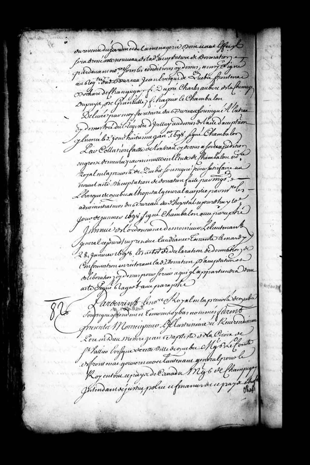 Transaction entre les Révérends Pères Jésuites et les administrateurs de l'Hôpital général de Québec par lequel, pour éviter contestation et procès, ces derniers cèdent, délaissent et transportent aux Pères Jésuites les droits et prétentions qu'ils peuvent avoir et prétendre sur les terres par eux acquises de Guillaume Fournier et sa femme, joignant le derrière des terres de la seigneurie d'Orsainville, à la réserve de la portion du terrain que les habitants de la Petite Auvergne et de Charlesbourg ont anticipé sur ladite terre par eux acquise dudit Fournier et sa femme, laquelle demeurera dépendante des habitants de ladite Auvergne et Charlesbourg et de la seigneurie de Notre-Dame-des-Anges (Notaire Charles Rageot de Saint-Luc), 24 mars 1698, Archives nationales à Québec, Fonds Intendants, (03Q,E1,S4,SS1,D162,P8).