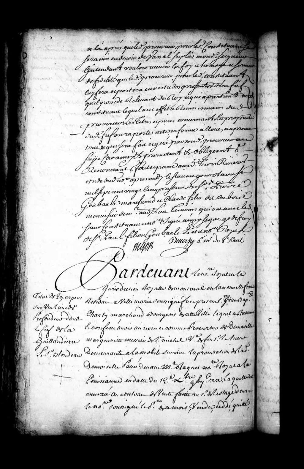 Contrat de vente par Jean-Baptiste Charly, marchand bourgeois de Montréal, au nom et comme procureur de damoiselle Marguerite Messier de Saint-Michel, veuve du feu sieur Le Sueur (LeSueur), demeurant à la Mobile, au sieur Maurice Blondeau, de Montréal, de la terre et fief de la Guillaudière consistant en 29 arpents de front sur une lieue de profondeur (Notaire Pierre Raimbault)
