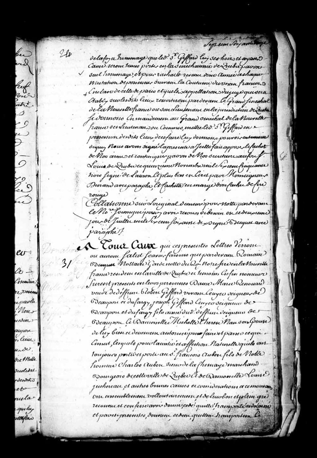 Acte de donation par dame Marie Renouard (Regnouard), veuve de Robert Giffard, et par Joseph Giffard, fils aîné dudit feu Robert Giffard, et damoiselle Michelle-Thérèse Nau (Nault), son épouse, à François Aubert, fils de Charles Aubert, sieur de la Chesnaye (LaChesnaye, Lachenaie), marchand de Québec, et de Louise Juchereau, de la seigneurie appelée Mille-Vaches, constituée de hauts bois et contenant trois lieues de front et quatre lieues de profondeur (Notaire Romain Becquet)