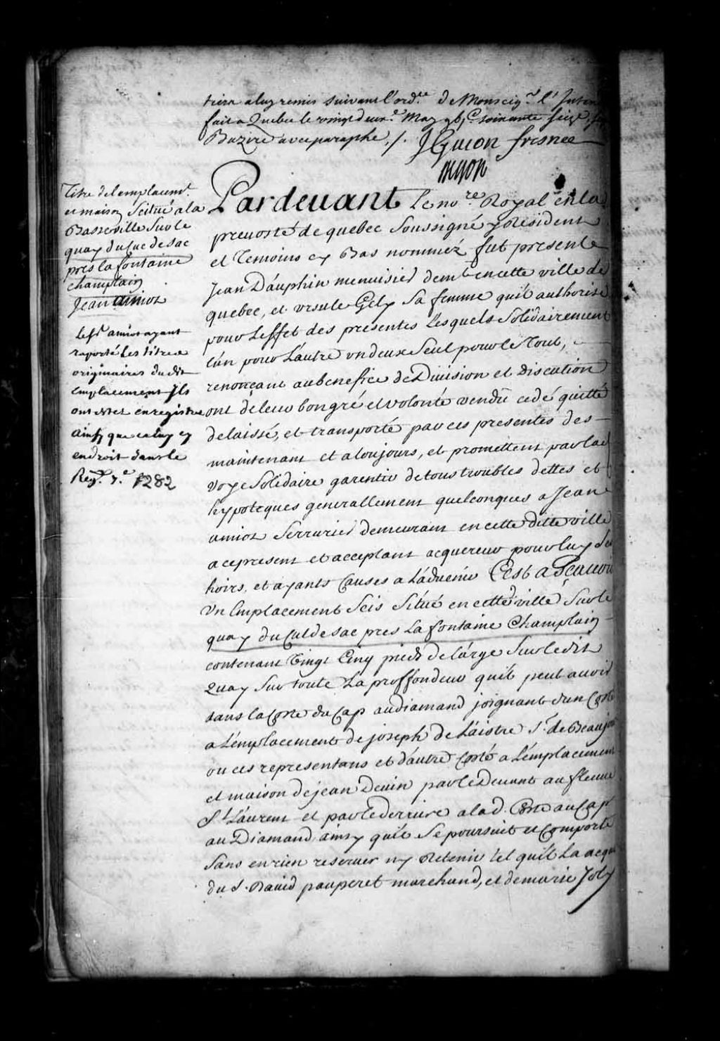 Contrat de vente par Jean Dauphin, menuisier de Québec, et Ursule Gely, sa femme, à Jean Amiot (Amyot), serrurier de Québec, d'un emplacement sis rue sur le quai du Cul-de-sac près de la fontaine Champlain en la Basse-Ville de Québec (Notaire Louis Chambalon), 17 juin 1713, Archives nationales à Québec, Fonds Intendants, (03Q,E1,S4,SS1,D173,P1).