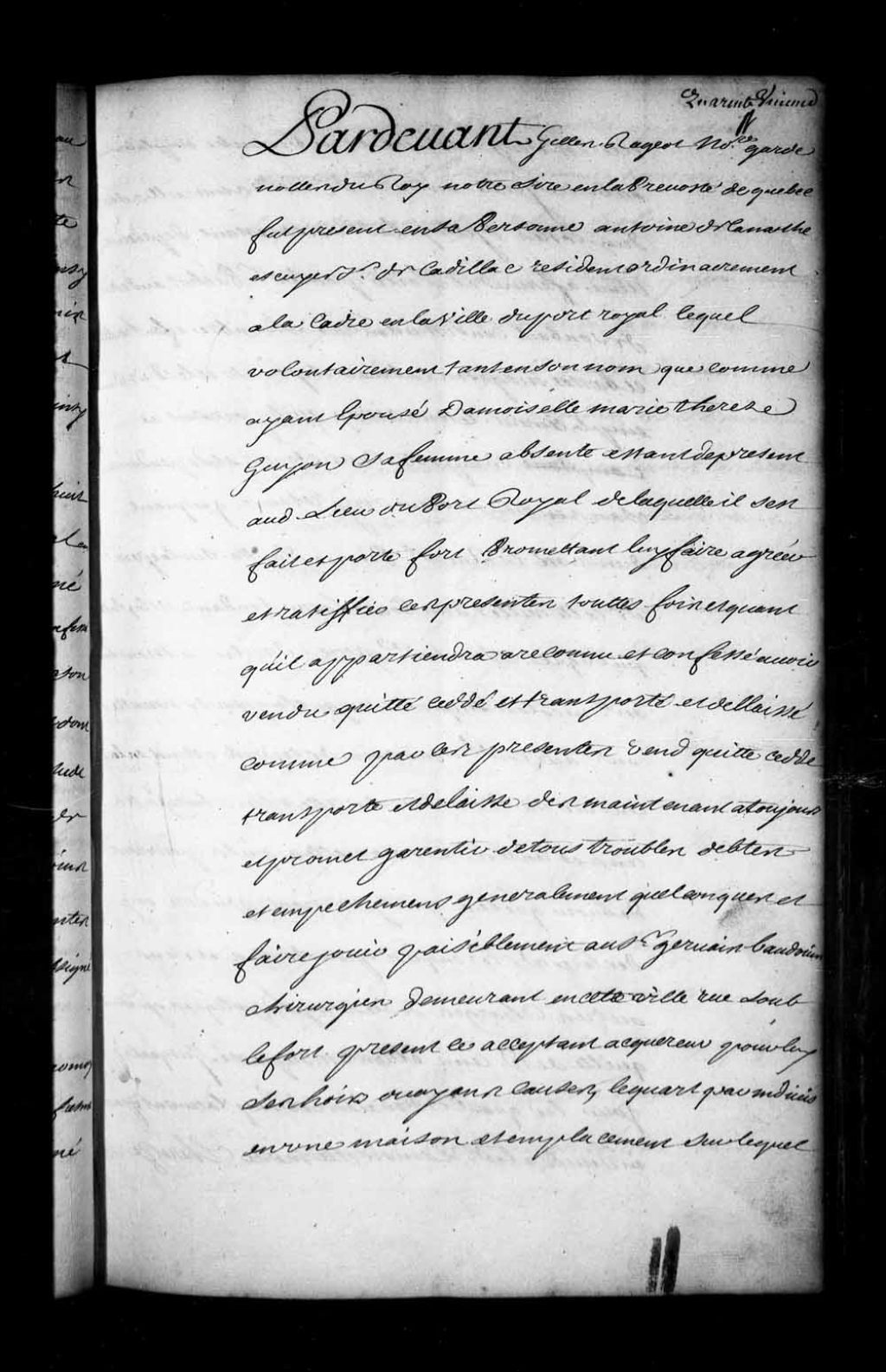 Contrat de vente par Antoine de Lamothe, sieur de Cadillac, écuyer, de la ville de Port-Royal en Acadie, et Marie-Thérèse Guyon, sa femme, à Gervais Baudouin (Beaudoin), chirurgien de la rue Sous-le-fort à Québec, du quart d'un emplacement et d'une maison sis rue Saint-Pierre en la Basse-Ville de Québec (Notaire Gilles Rageot), 11 juillet 1689, Archives nationales à Québec, Fonds Intendants, (03Q,E1,S4,SS1,D178,P8).