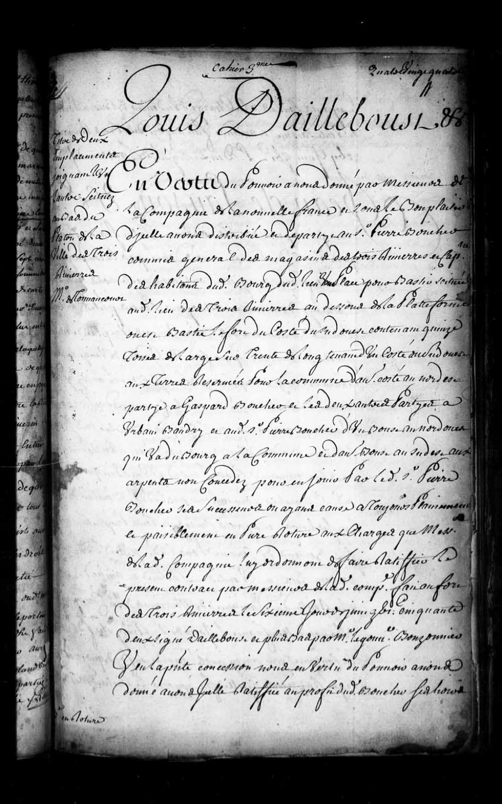 Concession par Louis d'Ailleboust, gouverneur de la Nouvelle-France, au sieur Pierre Boucher, commis général du magasin des Trois-Rivières et capitaine des habitants dudit bourg, d'un emplacement situé au-dessous de la plate-forme ouest aux Trois-Rivières, 17 juin 1652, Archives nationales à Québec, Fonds Intendants, (03Q,E1,S4,SS1,D185,P1).