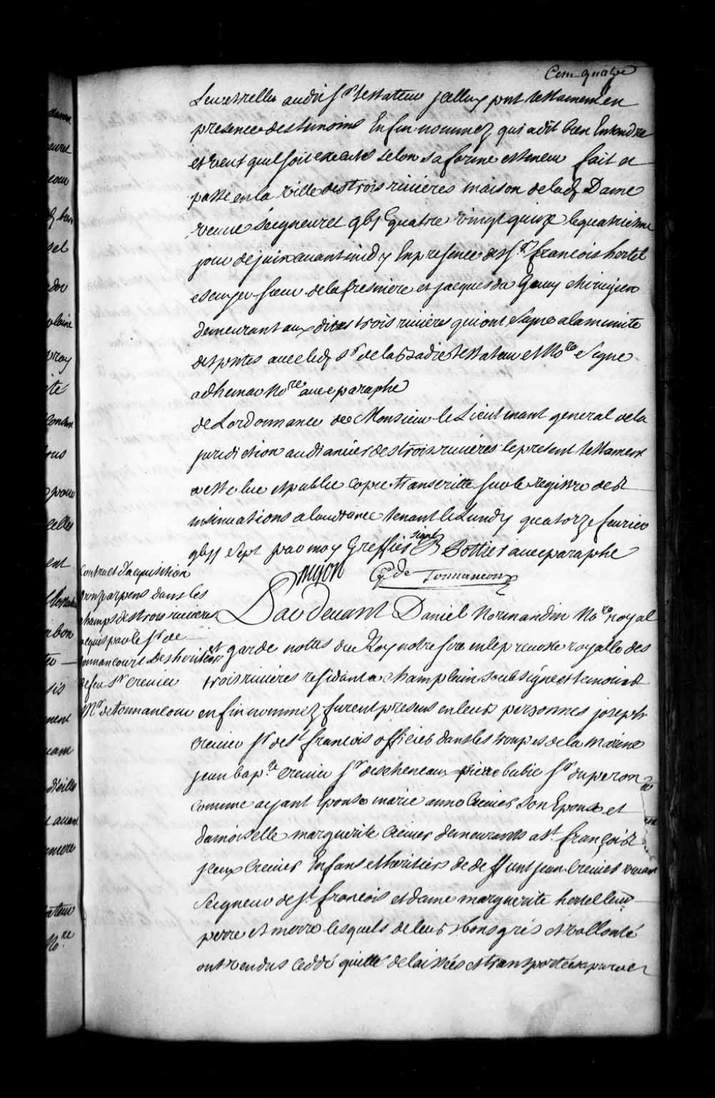 Contrat de vente par Joseph Crevier de Saint-François, écuyer, officier dans les troupes de la Marine, par Jean-Baptiste Crevier, sieur Deschenaux, par Pierre Babie (Baby), sieur Duperon (Duperron, du Perron), et Marie-Anne Crevier son épouse, et par damoiselle Marguerite Crevier au sieur René de Godefroy, écuyer, seigneur de Tonnancour, conseiller et procureur du Roi en la Prévôté des Trois-Rivières, d'une terre située dans les champs des Trois-Rivières (Notaire Daniel Normandin)