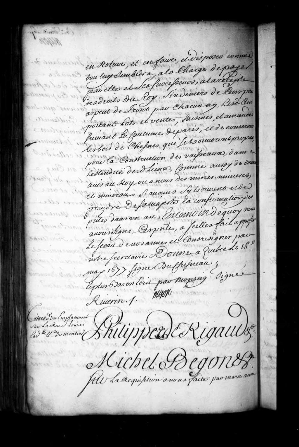 Acte de concession par Philippe de Rigaud, Marquis de Vaudreuil, et Michel Bégon, gouverneur et intendant en Nouvelle-France, à Marie-Anne Rivard, veuve du sieur François Dumontier, de son vivant premier secrétaire du Marquis de Vaudreuil, d'un emplacement sis rue Saint-Louis en la Haute-Ville de Québec et contenant quarante-cinq pieds de front sur cent dix-neuf pieds de profondeur du coté attenant à l'emplacement de Pierre Gacien dit Tourangeau (Gatien) et sur cent vingt-six pieds de l'autre coté faisant face au bastion du sud-ouest du fort Saint-Louis qui se termine par une ligne diagonale aboutissant à l'emplacement du nommé Larammée (Laramée)