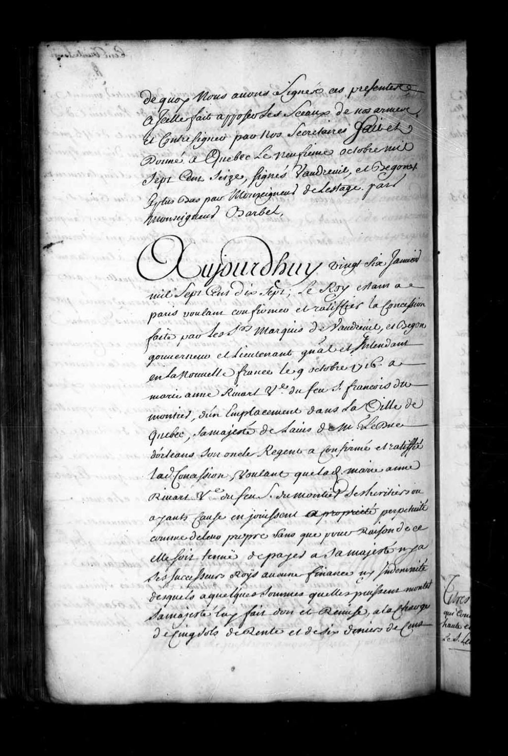 Brevet de confirmation par Sa Majesté de la concession accordée à Marie-Aimée Rivart (Rivard), veuve du feu sieur François Dumontier, d'un emplacement sis rue Saint-Louis en la Haute-Ville de Québec, laquelle concession ayant été faite le 9 octobre 1716 par les sieurs Marquis de Vaudreuil et Bégon, gouverneur et intendant de la Nouvelle-France, 26 janvier 1717, Archives nationales à Québec, Fonds Intendants, (03Q,E1,S4,SS1,D208,P2).