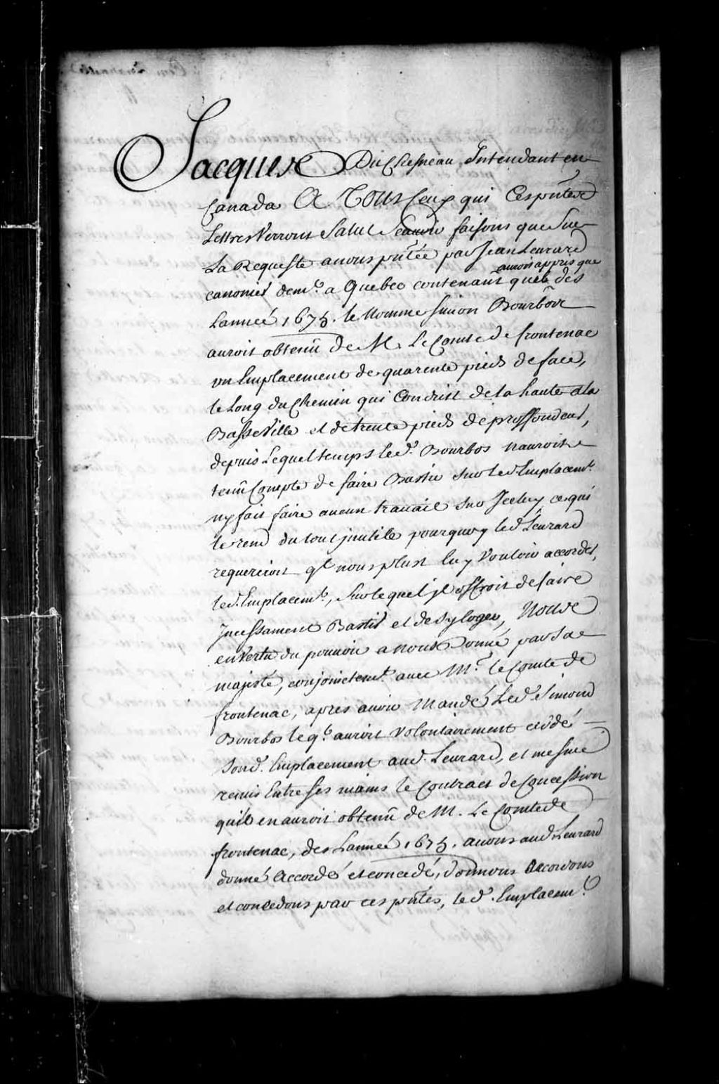 Concession par Jacques Duchesneau, intendant de la Nouvelle-France, à Jean Levrard, canonnier demeurant à Québec, d'un emplacement situé sur la rue qui conduit de la Haute-Ville à la Basse-Ville de Québec (côte de la Montagne), laquelle concession ayant été retirée à Simon Bourbos (Bourbeau) pour avoir manqué aux termes de la concession initiale