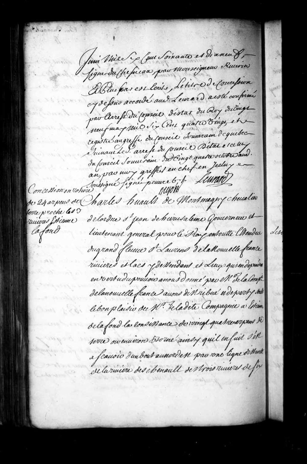 Concession par Charles Huault de Montmagny, Chevalier de l'Ordre de Saint-Jean de Jérusalem, gouverneur et lieutenant général pour Sa Majesté en Nouvelle-France, à Étienne de la Fond (LaFond) d'une terre aux Trois-Rivières, laquelle étant bornée d'un bout au nord-est par une ligne parallèle à la rivière Descheneaux (Deschenault, Deschenaux), en étant distante de six toises, de l'autre bout au sud-ouest par les terres non concédées, d'un côté au sud-est par les terres de Pierre Boucher et de l'autre côté au nord-est par celles de Gaspard Boucher