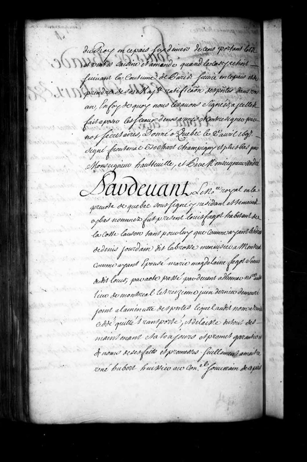 Contrat de vente par Louis Fagot, de la côte de Lauzon, à René Hubert, huissier au Conseil souverain, d'une terre sise sur la petite rivière Saint-Charles à Québec (Notaire Charles Rageot de Saint-Luc), 9 octobre 1701, Archives nationales à Québec, Fonds Intendants, (03Q,E1,S4,SS1,D214,P2).