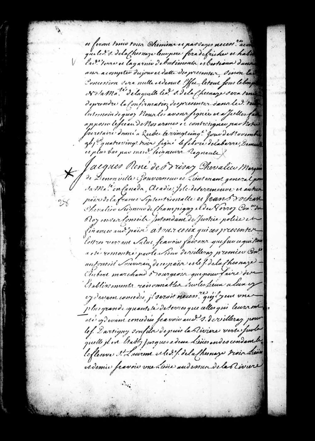 Acte de concession par Jacques-René de Brisay, Marquis de Denonville, et par Jean Bochart Champigny, gouverneur et intendant de la Nouvelle-France, au sieur Rouer de Villeray, premier conseiller au Conseil souverain de la Nouvelle-France, pour son fils le sieur Rouer d'Artigny, et au sieur Charles Aubert de la Chesnaye (Lachesnaye), marchand bourgeois, de l'étendue de terre qui se peut rencontrer entre leurs concessions, avec deux lieues de profondeur, de laquelle étendue ils jouiront chacun de la moitié, à savoir pour ledit sieur d'Artigny de celle qui joint la petite rivière Verte et les îlets et les battures vis-à-vis ladite moitié, lesquelles portions ne formant dorénavant qu'une seule seigneurie, étant incorporées à leurs concessions initiales, aux mêmes droits accordés par les titres de leurs concessions primitives