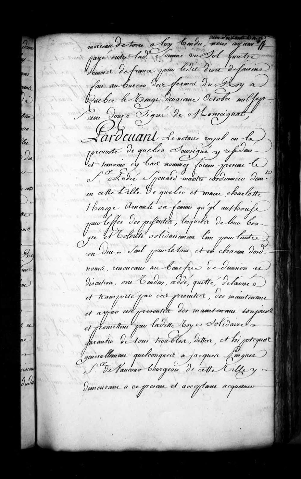 Contrat de vente par André Spenard (Spennert), maître cordonnier demeurant à Québec, et Marie-Charlotte-Thérèse Arnault (Arnaud), sa femme, à Jacques Pinguet, sieur de Vaucour, bourgeois de Québec, de leurs droits et prétentions sur un emplacement sis rue Sainte-Anne en la Haute-Ville de Québec (Notaire Louis Chambalon)