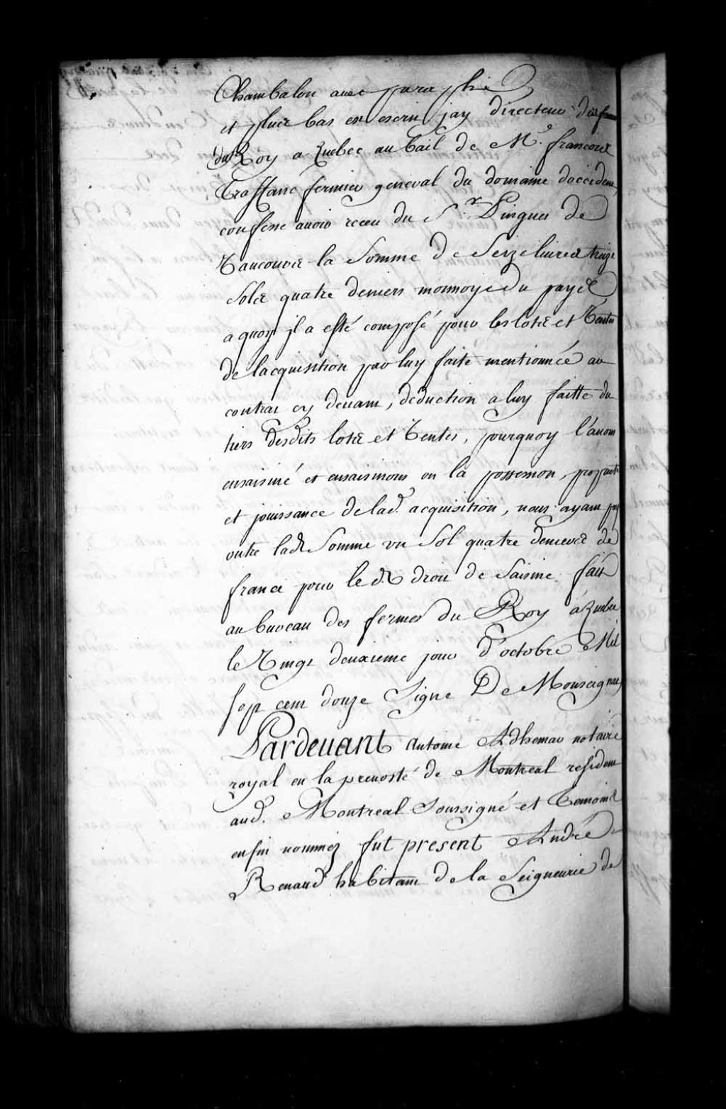 Contrat de vente par André Renaud, habitant de la seigneurie de la Trinité, au sieur Jacques Pinguet de Vaucour, bourgeois de Québec, absent, le sieur Jean-Baptiste Hervieux, marchand de Montréal, acceptant pour lui, d'un emplacement sis en la Haute-Ville de Québec, lequel emplacement étant borné d'un bout par la rue Sainte-Anne (Notaire Antoine Adhémar dit Saint-Martin)