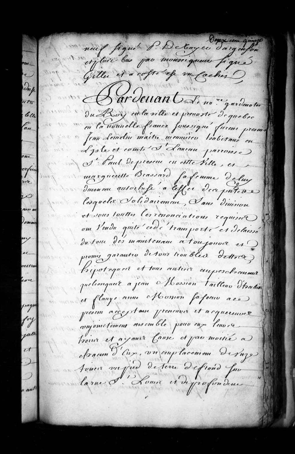 Contrat de vente par Jean Lemelin, maître menuisier, habitant de l'île et comté de Saint-Laurent en la paroisse Saint-Paul, et Marguerite Brassard, sa femme, à Jean Mossion (Moussion), tailleur d'habits, et Flavie-Anne Mossion, sa soeur, d'un emplacement sis rue Saint-Louis en la Haute-Ville de Québec (Notaire François Genaple de Bellefonds), 10 octobre 1698, Archives nationales à Québec, Fonds Intendants, (03Q,E1,S4,SS1,D227,P2).