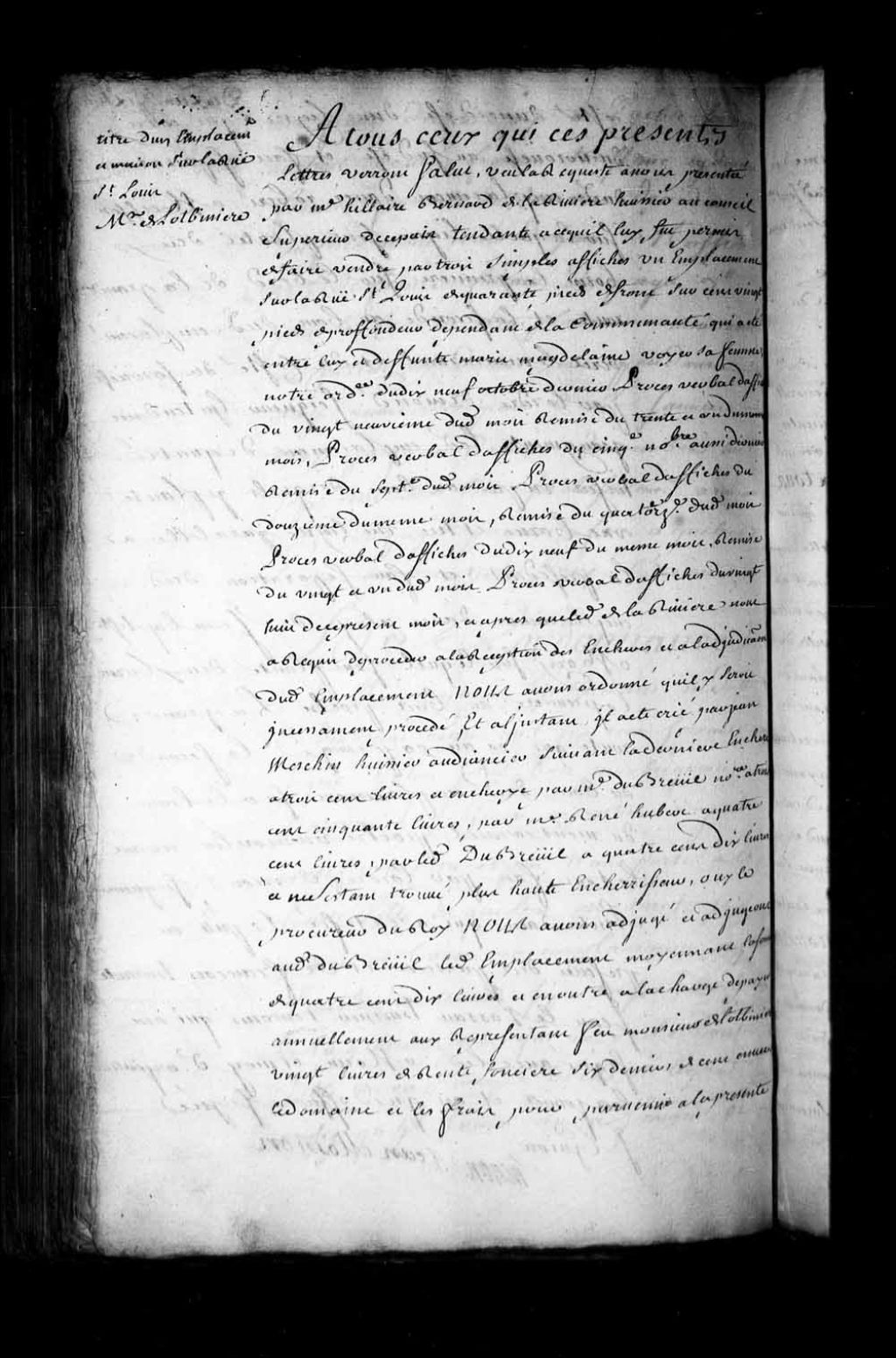 Sentence et procès-verbal d'adjudication à Maître Dubreuil, notaire, pour Maître Eustache Chartier de Lotbinière, écuyer, conseiller au Conseil, d'un emplacement sis rue Saint-Louis en la Haute-Ville de Québec, suite à la requête de Maître Hilaire Bernard de la Rivière (LaRivière), huissier au Conseil souverain en Nouvelle-France, laquelle requête demandant la mise en vente par licitation desdites propriétés, 30 janvier 1714, Archives nationales à Québec, Fonds Intendants, (03Q,E1,S4,SS1,D228,P1).