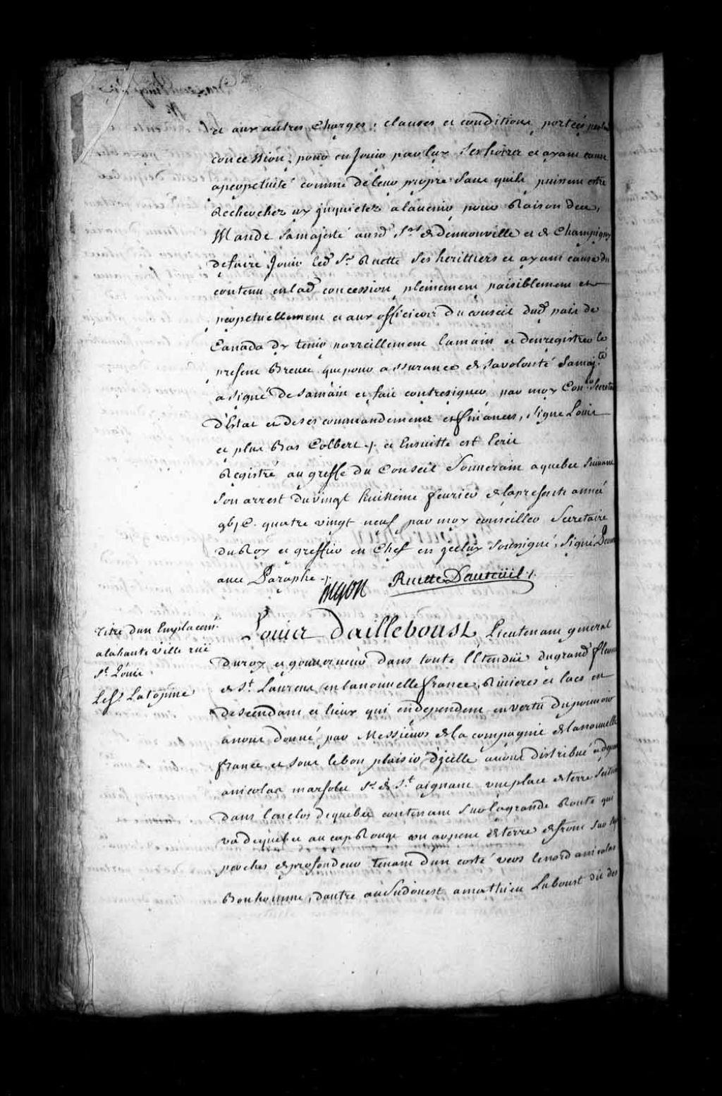 Concession par Louis d'Ailleboust, gouverneur et lieutenant général pour le Roi en la Nouvelle-France, à Nicolas Marsolet, sieur de Saint-Aignant (Saint-Aignan), d'un emplacement sis dans l'enclos de Québec, contenant un arpent de terre de front sur la grande route qui conduit de Québec et Cap-Rouge (Grande Allée), 10 février 1651, Archives nationales à Québec, Fonds Intendants, (03Q,E1,S4,SS1,D231,P1).