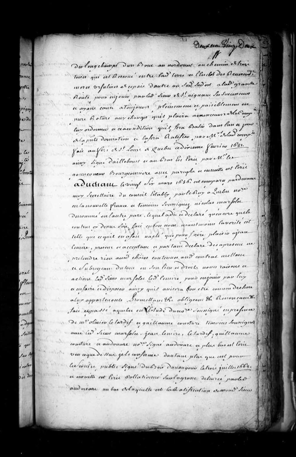 Déclaration de Nicolas Marsolet quant au fait que la concession à lui faite d'un emplacement sis sur la Grande Allée à Québec par Louis d'Ailleboust, gouverneur, a été faite pour Jean Lemire, lequel étant dès lors propriétaire dudit emplacement (Notaire Guillaume Audouart dit Saint-Germain), 26 mars 1656, Archives nationales à Québec, Fonds Intendants, (03Q,E1,S4,SS1,D231,P2).