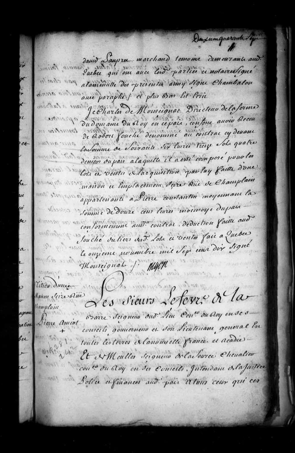 Reçu pour le paiement des droits de lots et ventes par Robert Fouché (Foucher), 11 novembre 1710, Archives nationales à Québec, Fonds Intendants, (03Q,E1,S4,SS1,D237,P6).
