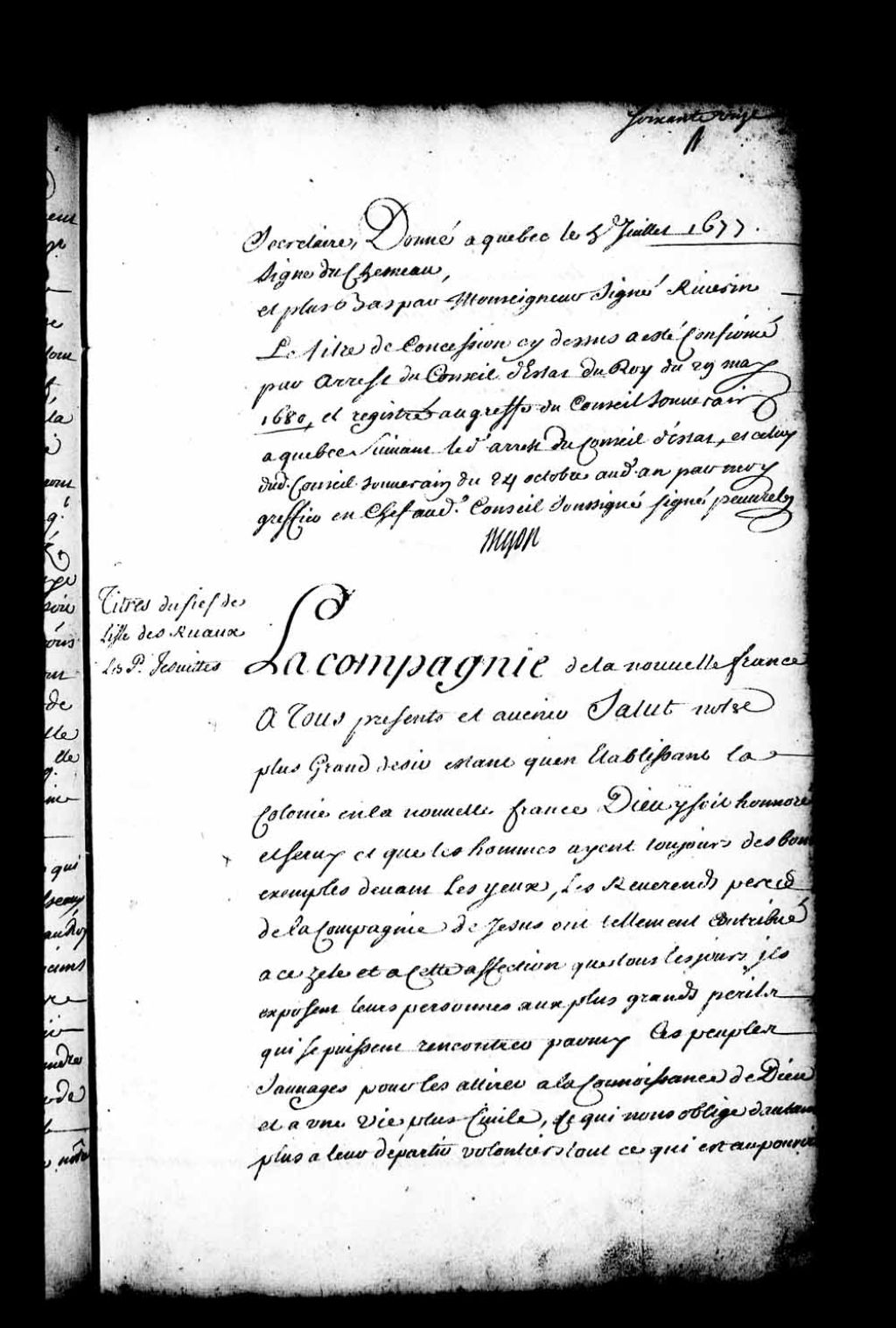 Ratification par le Conseil d'État du Roi de la concession faite à damoiselle Marie-Anne Juchereau, veuve du feu sieur de la Combe (Lacombe), d'une étendue de terre le long du fleuve Saint-Laurent et attenante aux terres du sieur Saint-Denis, son père, laquelle concession ayant été faite le 5 juillet 1677 par Jacques Duchesneau, intendant