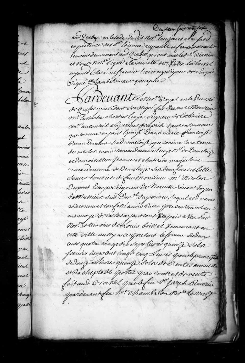 Quittance d'Eustache Chartier, écuyer, seigneur de Lotbinière et conseiller au Conseil supérieur, tant en son nom que comme ayant épousé Marie-Françoise Renau Davenne de Desmeloise (Renaud d'Avesnes de Méloise), et comme curateur de Nicolas-Marie Reneau Davenne, écuyer, sieur de Desmeloize, Jeanne Reneau Davenne de Desmeloise et Catherine-Madeleine Reneau Davenne de Desmeloise, ses beau-frère et belles-soeurs, héritiers du feu sieur Nicolas Dupont, écuyer, seigneur de Neuville, de son vivant doyen des messieurs du Conseil supérieur, en faveur de Louis Boissel, demeurant à Québec, quant aux frais stipulés dans le contrat d'échange passé le 11 février 1713 devant le notaire Louis Chambalon (Notaire Pierre Rivet dit Cavelier)
