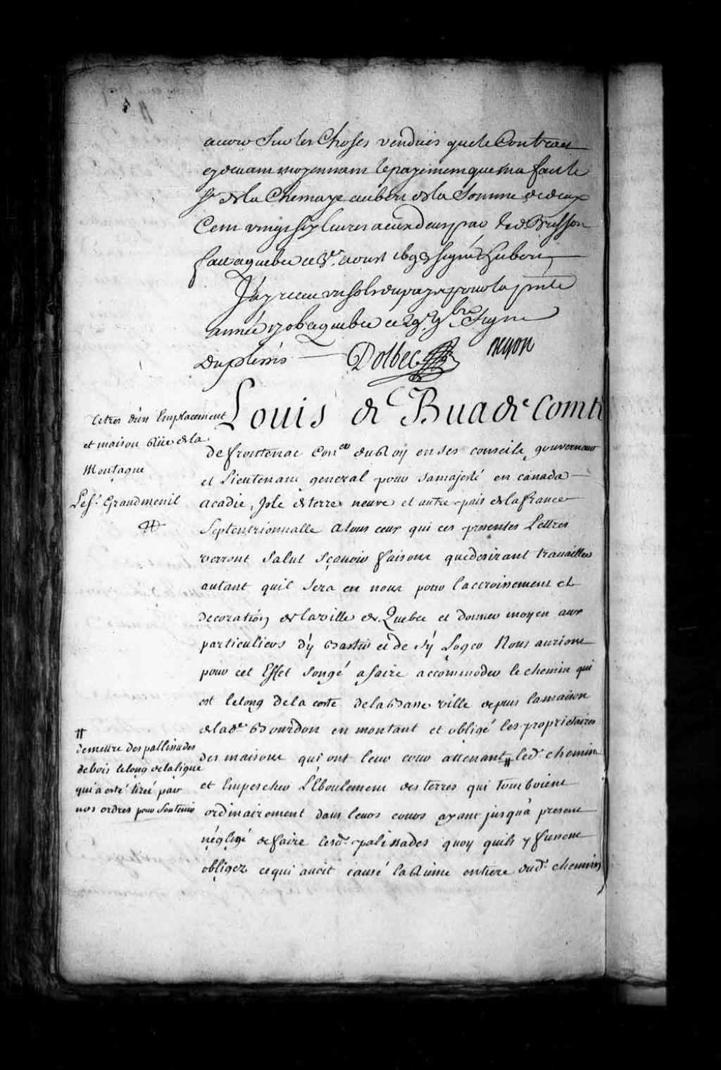 Concession par Louis de Buade, Comte de Frontenac, gouverneur et lieutenant général pour Sa Majesté en Nouvelle-France, à Louis Leparc dit Saint-Louis, demeurant à Québec, d'un emplacement sis sur la côte de la Basse-Ville de Québec (côte de la Montagne), 23 mai 1674, Archives nationales à Québec, Fonds Intendants, (03Q,E1,S4,SS1,D248,P1).