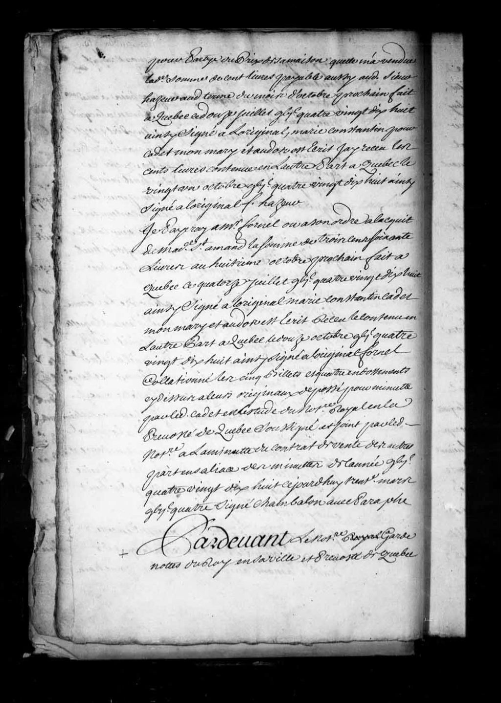 Transaction entre les Révérendes Mères Religieuses du Monastère de l'Hôtel-Dieu de Québec, autorisées par monseigneur Louis Ango des Maizerets, grand chantre de l'église cathédrale de Québec et grand vicaire de monseigneur l'Évêque de Québec, d'une part, le sieur Levrard, maître canonnier entretenu pour le service du Roi à Québec, et damoiselle Catherine-Angélique Becquet, sa femme, fille de feu Romain Becquet, de son vivant notaire royal à Québec, et de feu Marie Pellerin, desquels elle est héritière et douairière, d'autre part, en encore le sieur Michel Cadet, marchand boucher de Québec, quant à la moitié franche d'un emplacement et d'une maison sis rue Saint-Pierre en la Basse-Ville de Québec (Notaire François Genaple de Bellefonds)