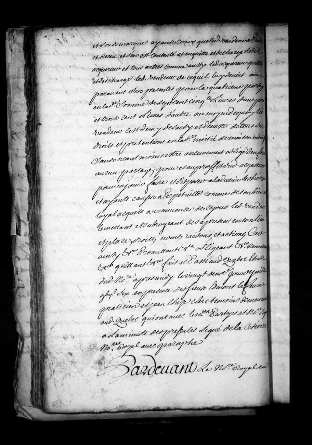 Contrat de vente par Florent de La Cetière, notaire royal demeurant en la Prévôté de Québec, comme procureur de Marie Chasle, veuve du feu sieur Jean Jung, de son vivant marchand bourgeois en la ville de Bordeaux en l'ancienne France, au sieur Claude Chasle, demeurant ordinairement à Ville-Marie en l'île de Montréal, de la moitié d'une maison sise rue Sous-le-fort en la Basse-Ville de Québec (Notaire Jacques Barbel)