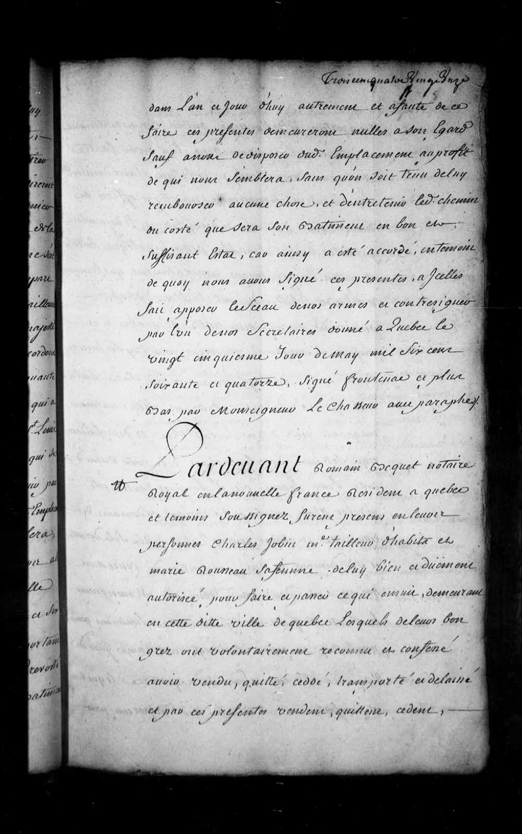Contrat de vente par Charles Jobin, maître tailleur d'habits, et Marie Rousseau, sa femme, à Claude Phillipeau (Philippeau), maître tailleur d'habits de Québec, d'un emplacement sis sur la rue qui va de la Haute-Ville à la Basse-Ville de Québec (côte de la Montagne) (Notaire Romain Becquet)