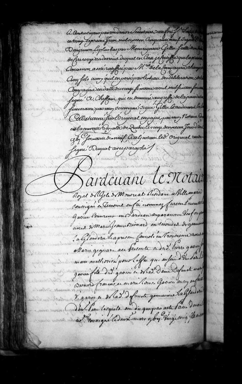 Contrat de vente par Pierre Gassien (Gacien, Gatien), couvreur en bardeaux, auparavant veuf en premières noces de Marie-Jeanne Besnard (Bénard), en secondes de Geneviève LaGlanderie (Pinguet dit LaGlardière) et époux en troisièmes noces de Marie Gignart (Gignard), d'une part, et par Pierre Gassien, fils dudit Gassien et de Marie-Jeanne Besnard, et François Gassien et Marie-Louise Gassien, enfants dudit Gassien et de Geneviève LaGlanderie, d'autre part, à Jean-Baptiste Gassien, acceptant par Dorothée Juchereau (Jinchereau), sa femme, d'un emplacement et d'une maison sis rue Saint-Louis en la Haute-Ville de Québec (Notaire Jean-Baptiste Adhémar dit Saint-Martin)