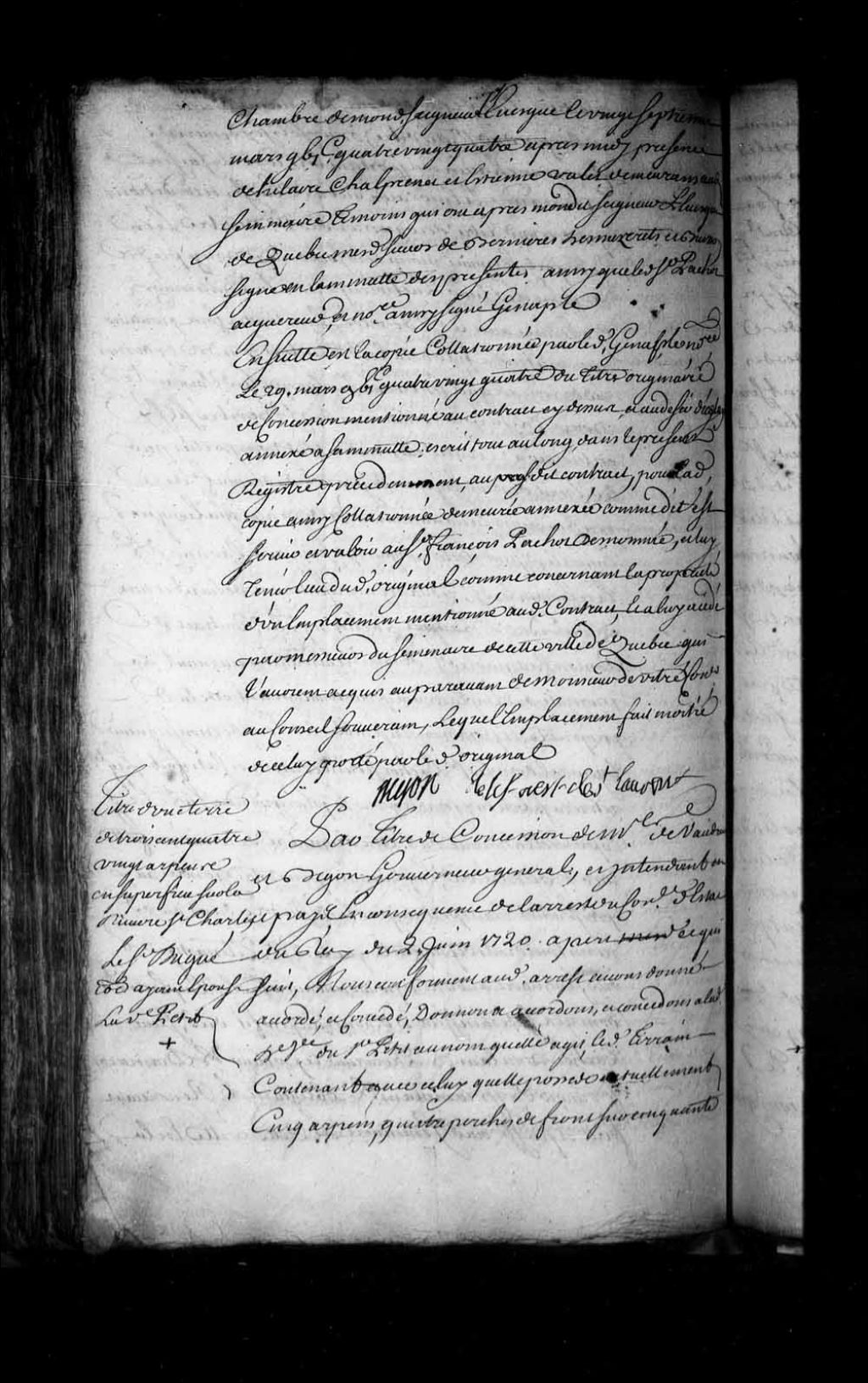 Concession par Philippe de Rigaud, Marquis de Vaudreuil, gouverneur de la Nouvelle-France, et Michel Bégon, intendant de la Nouvelle-France, à la dame veuve Petit d'un emplacement donnant sur la petite rivière Duberger et borné par les routes Saint-Bernard et Saint-Charles, 13 octobre 1721, Archives nationales à Québec, Fonds Intendants, (03Q,E1,S4,SS1,D297,P1).