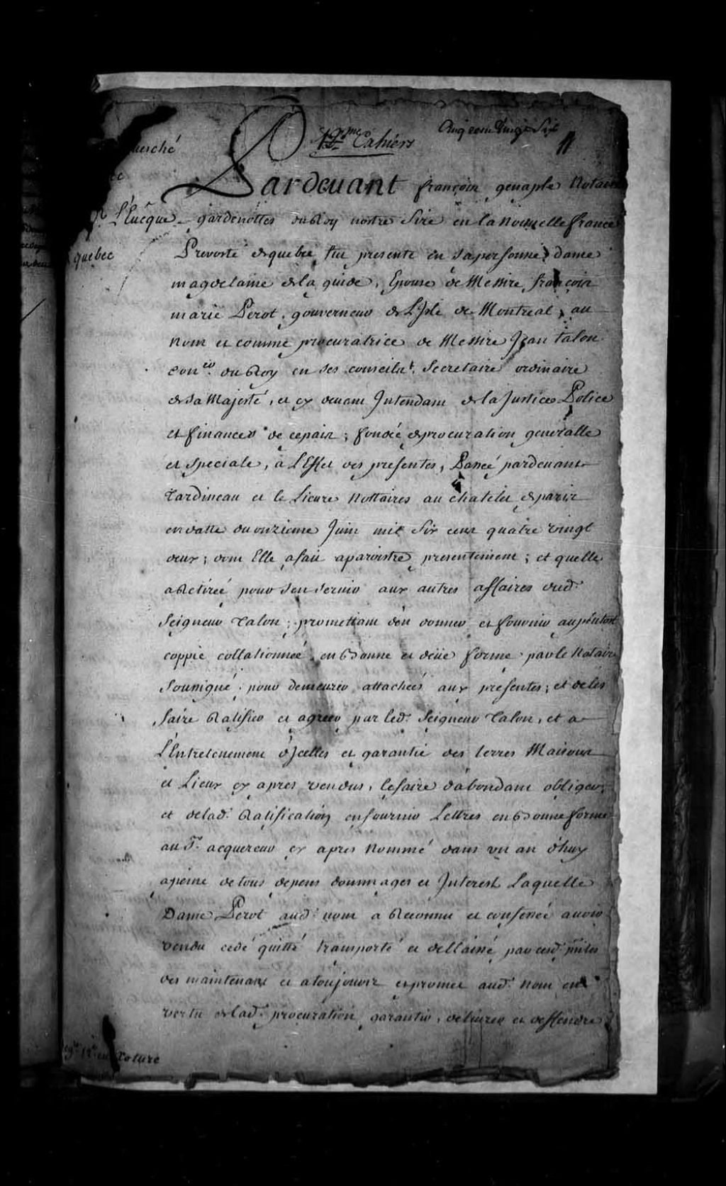 Contrat de vente par dame Madeleine de LaGuide, épouse de messire François-Marie Perot (Perrot, Perrault), gouverneur de l'île de Montréal, au nom et comme procureure de messire Jean Talon, conseiller du Roi, secrétaire ordinaire de Sa Majesté et intendant en Nouvelle-France, à messire François Provost, écuyer, major du château de Québec, d'un emplacement et de deux maisons sis derrière le cap appelé le Sault au Matelot en la Basse-Ville de Québec, lequel emplacement étant en outre borné par le grand chemin et par le cimetière (Notaire François Genaple de Bellefonds)