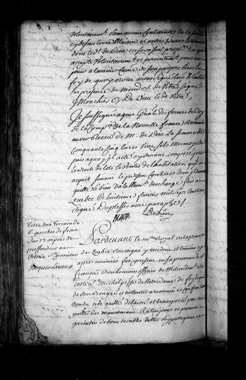 Contrat de vente par le sieur François Bonhomme, officier de milice de la côte Saint-Michel en la paroisse Notre-Dame de Foy (Sainte-Foy), au sieur Jacques Lavaux (Delavaux), tanneur demeurant à la côte Saint-Jean, d'un emplacement sis côte Sainte-Geneviève à Québec (Notaire Jean-Étienne Dubreuil)