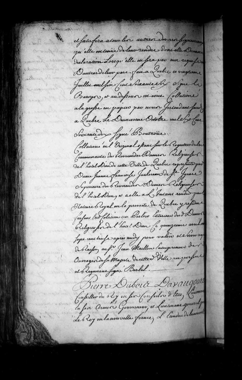 Concession par Pierre Dubois d'Avaugour, conseiller du Roi, lieutenant en Ses armées, gouverneur et lieutenant général de la Nouvelle-France, à Denis Duquet de ce qui reste de terre entre l'emplacement dudit Duquet et celui du sieur Fontaine, laquelle concession étant bornée d'un bout par un chemin qui va du fort au Mont-Carmel et de l'autre par la Grande Allée à Québec, 20 juillet 1663, Archives nationales à Québec, Fonds Intendants, (03Q,E1,S4,SS1,D315,P5).