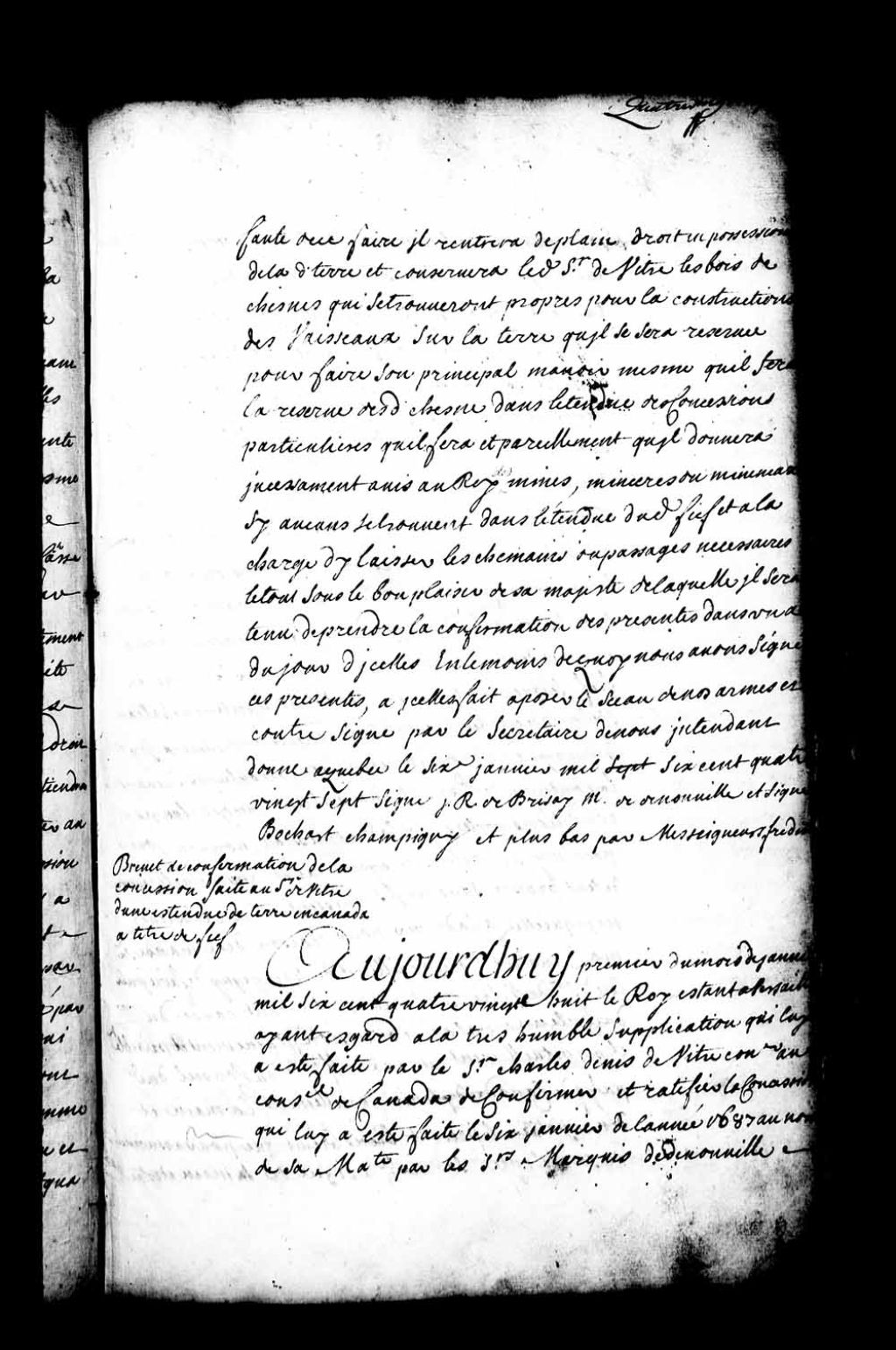 Brevet de confirmation par Sa Majesté de la concession faite au sieur Charles Denys de Vitré d'une étendue de terre attenante aux terres du sieur de Villeray le long du fleuve Saint-Laurent, laquelle concession ayant été faite le 6 janvier 1687 par messires de Denonville et Bochart Champigny, 1er janvier 1688, Archives nationales à Québec, Fonds Intendants, (03Q,E1,S4,SS1,D31,P2).
