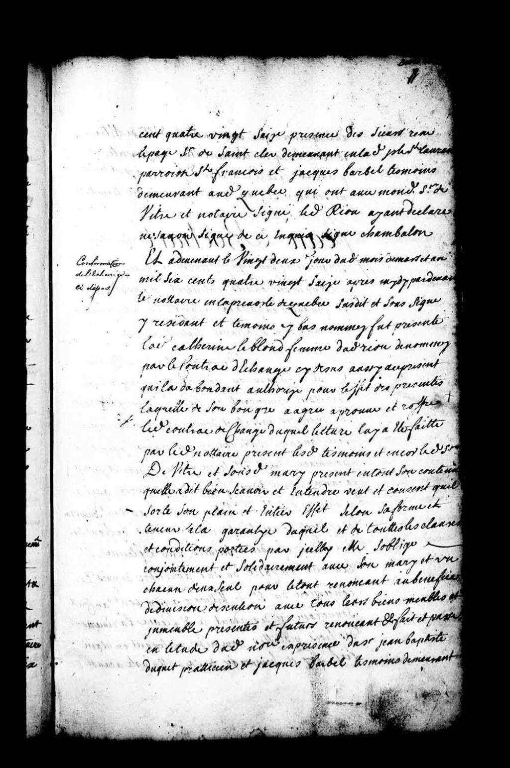 Ratification par Catherine Leblond, femme de Jean Riou (Rioux), du contrat d'échange passé le 15 mars 1696 devant le notaire Louis Chambalon (Notaire Louis Chambalon), 22 mars 1696, Archives nationales à Québec, Fonds Intendants, (03Q,E1,S4,SS1,D31,P4).