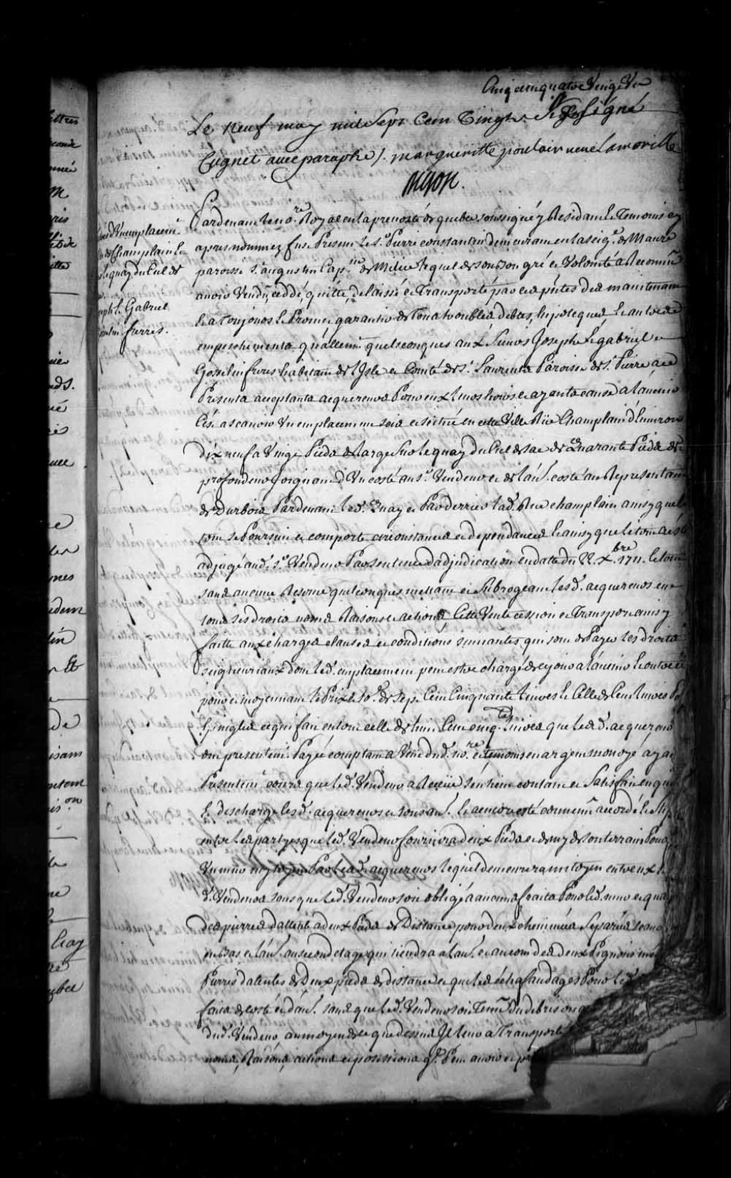 Contrat de vente par le sieur Pierre Constantin, demeurant en la seigneurie de Maur, paroisse de Saint-Augustin, capitaine de milice, aux sieurs Joseph Gosselin et Gabriel Gosselin, frères, habitant en la paroisse Saint-Pierre de l'île et comté de Saint-Laurent (île d'Orléans), d'un emplacement sis rue Champlain en la Basse-Ville de Québec (Notaire Jean-Étienne Dubreuil), 17 juin 1725, Archives nationales à Québec, Fonds Intendants, (03Q,E1,S4,SS1,D322,P1).