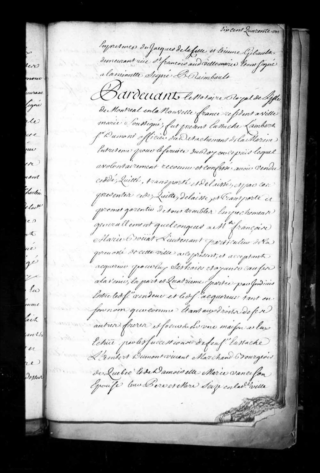 Contrat de vente par Eustache Lambert, sieur Dumont, officier du détachement de la Marine entretenu pour le service du Roi en la Nouvelle-France, à Maître François-Marie Bouat, lieutenant particulier de la Prévôté de Montréal, du quart par indivis d'un emplacement et d'une maison sis rue Notre-Dame et place Royale en la Basse-Ville de Québec, à eux échue par la succession du feu sieur Eustache Lambert Dumont, de son vivant marchand bourgeois de Québec, et de damoiselle Marie Vanceson (Vanneck), ses père et mère (Notaire Pierre Raimbault)