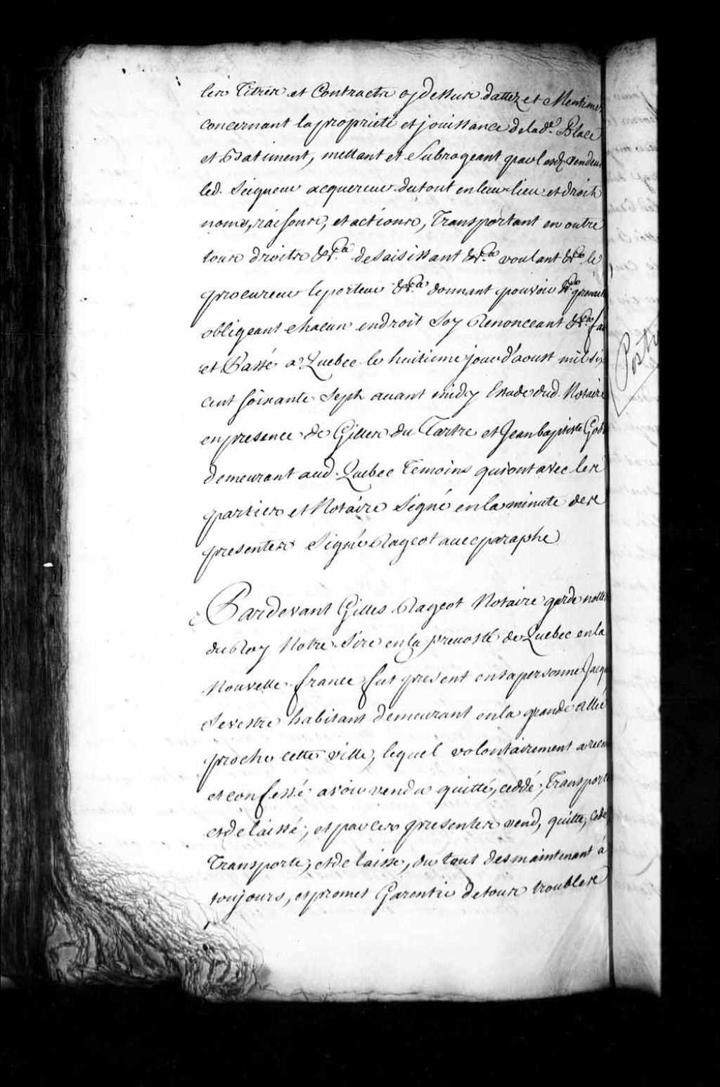 Contrat de vente par Jacques Sevestre, demeurant sur la Grande Allée, près de Québec, à messire Jean Talon, conseiller du Roi et intendant en la Nouvelle-France, d'un emplacement et d'une charpente de maison sis sur la grande place (place Royale) en la Basse-Ville de Québec (Notaire Gilles Rageot), 30 septembre 1668, Archives nationales à Québec, Fonds Intendants, (03Q,E1,S4,SS1,D337,P2).