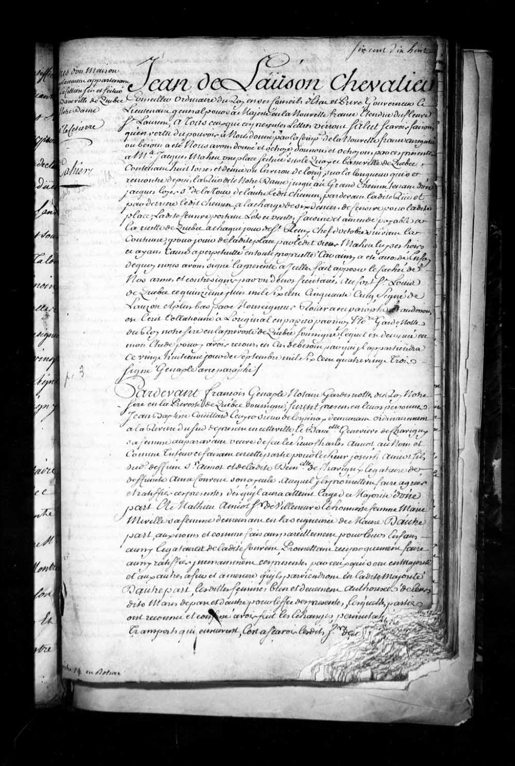 Contrat d'échange entre Jean-Baptiste Couillard, écuyer, sieur de Lespinay, et damoiselle Geneviève de Chavigny, sa femme, auparavant veuve du feu sieur Charles Amiot (Amyot), au nom et comme tuteurs faisant pour Joseph Amiot, fils dudit feu Amiot et de ladite damoiselle, d'une part, et Mathieu Amiot de Villeneuve et Marie Miville, sa femme, demeurant en la seigneurie de Maur, d'autre part, d'un emplacement sis en la Basse-Ville de Québec au pied du chemin de la côte qui conduit à la Haute-Ville de Québec (côte de la Montagne), en retour d'une terre sise sur le chemin de la Grande Allée qui conduit de Québec au Cap-Rouge, respectivement (Notaire François Genaple de Bellefonds)