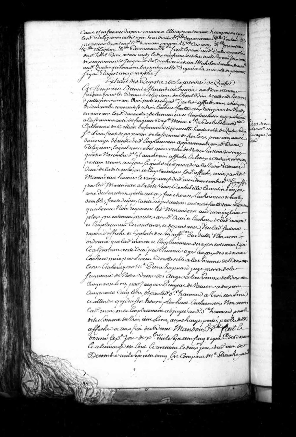 Sentence et procès-verbal d'adjudication au sieur Pierre Haymard (Aymard, Émard), juge prévôt de la seigneurie de Notre-Dame-des-Anges, d'un emplacement sis rue Saint-Louis en la Haute-Ville de Québec, suite à la requête d'Étienne Marandeau (Morandeau, Maranda), au nom et comme faisant pour les Dames Religieuses de l'Hôtel-Dieu, suite au défaut de paiement de la communauté du feu Jean-Baptiste Morin, sieur de Rochebelle, et damoiselle Catherine de Belleau (Bellot), sa femme, laquelle requête demandant la mise en vente par licitation desdites propriétés, 1er décembre 1705, Archives nationales à Québec, Fonds Intendants, (03Q,E1,S4,SS1,D340,P3).