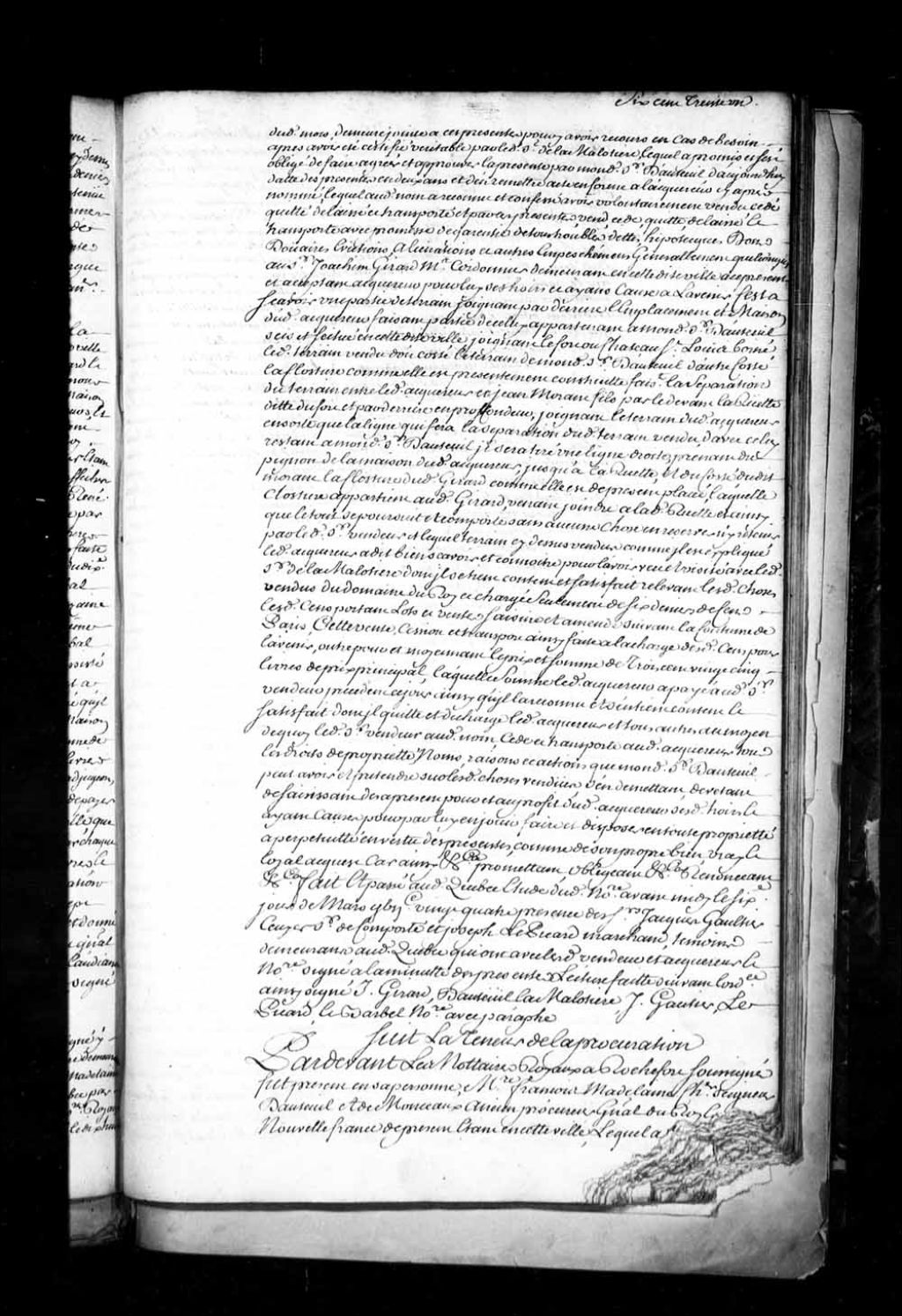 Procuration de Maître François-Madeleine, Chevalier, seigneur d'Auteuil et de Monceau (Monceaux), ancien procureur général du Roi en Nouvelle-France, envers Maître d'Auteuil de la Malotière (LaMalotière), son fils, lui donnant pouvoir de régir et gouverner les biens qu'il a au Canada (Notaires Le Picard et Barbel, Rochefort, France)