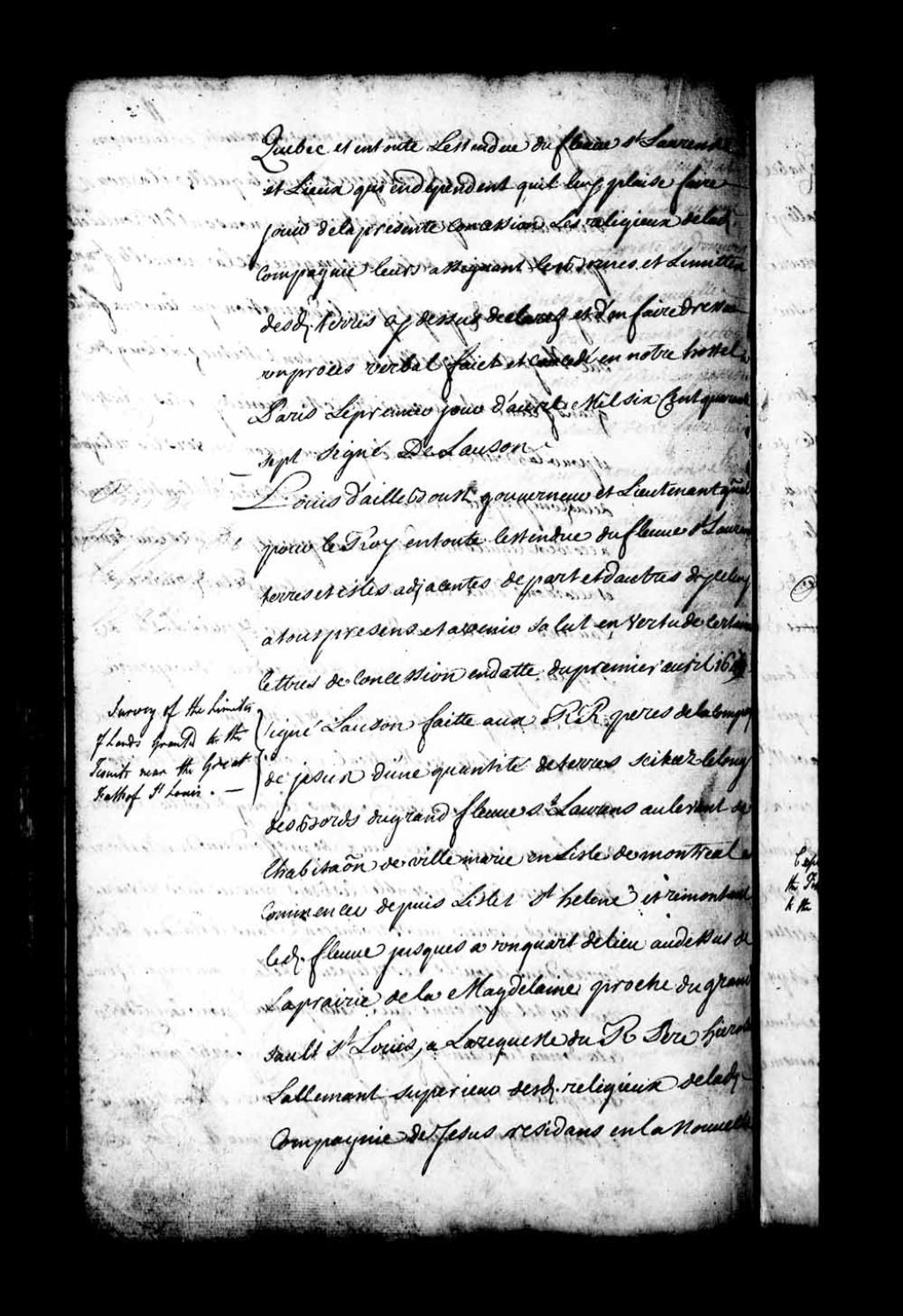 Procès-verbal par Louis d'Ailleboust, gouverneur et lieutenant général pour le Roi en toute l'étendue du fleuve Saint-Laurent, fixant les bornes et limites de la concession de la Prairie-de-la-Madeleine et constatant la prise de possession de ladite concession par les Pères Jésuites, en présence de François de Chavigny et de Jean Bourdon, 3 mai 1649, Archives nationales à Québec, Fonds Intendants, (03Q,E1,S4,SS1,D40,P2).