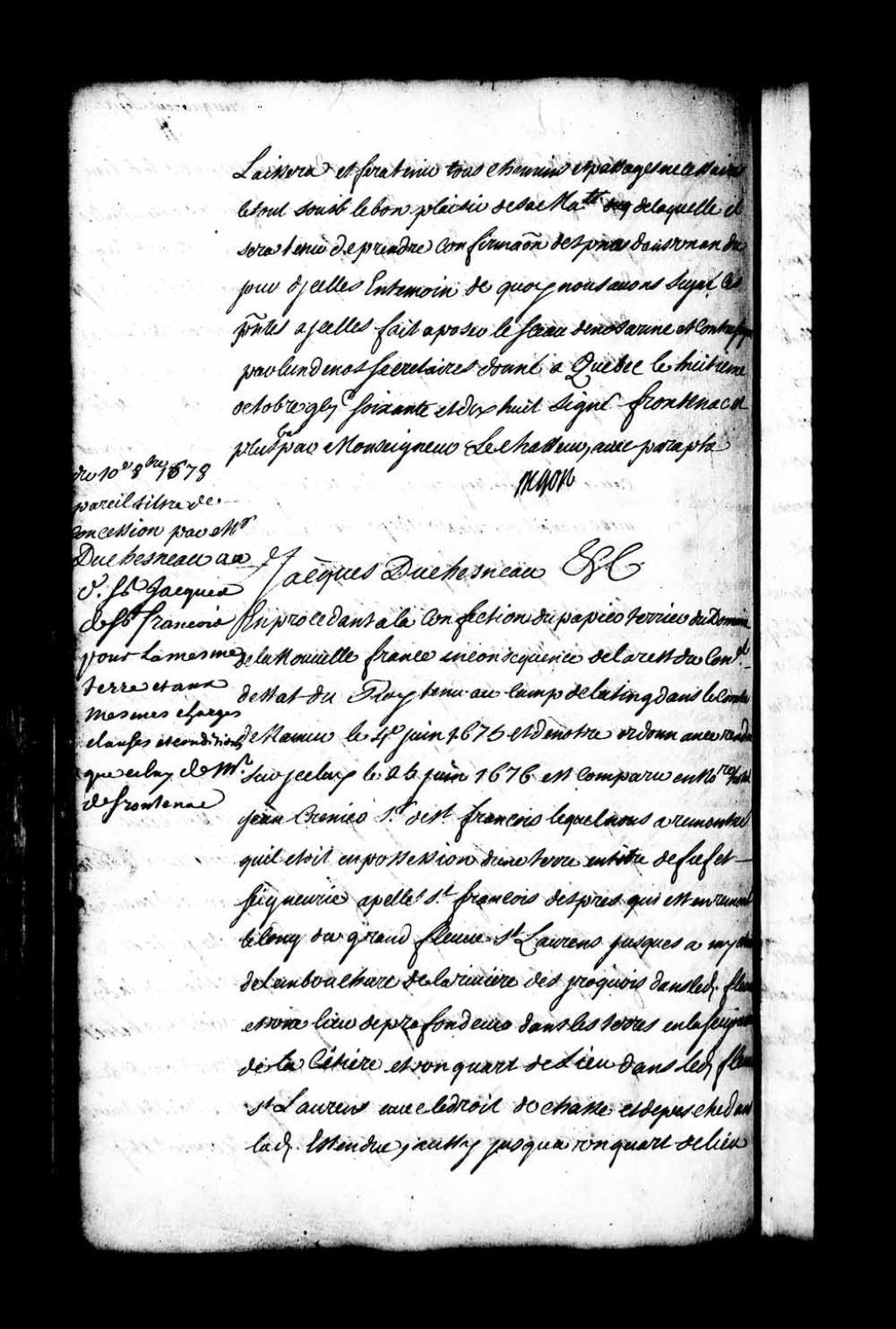 - Acte de concession par Jacques Duchesneau, intendant de la Nouvelle-France, à Jacques Crevier, sieur de Saint-François, d'une lieue de terre de profondeur en montant la rivière Saint-François