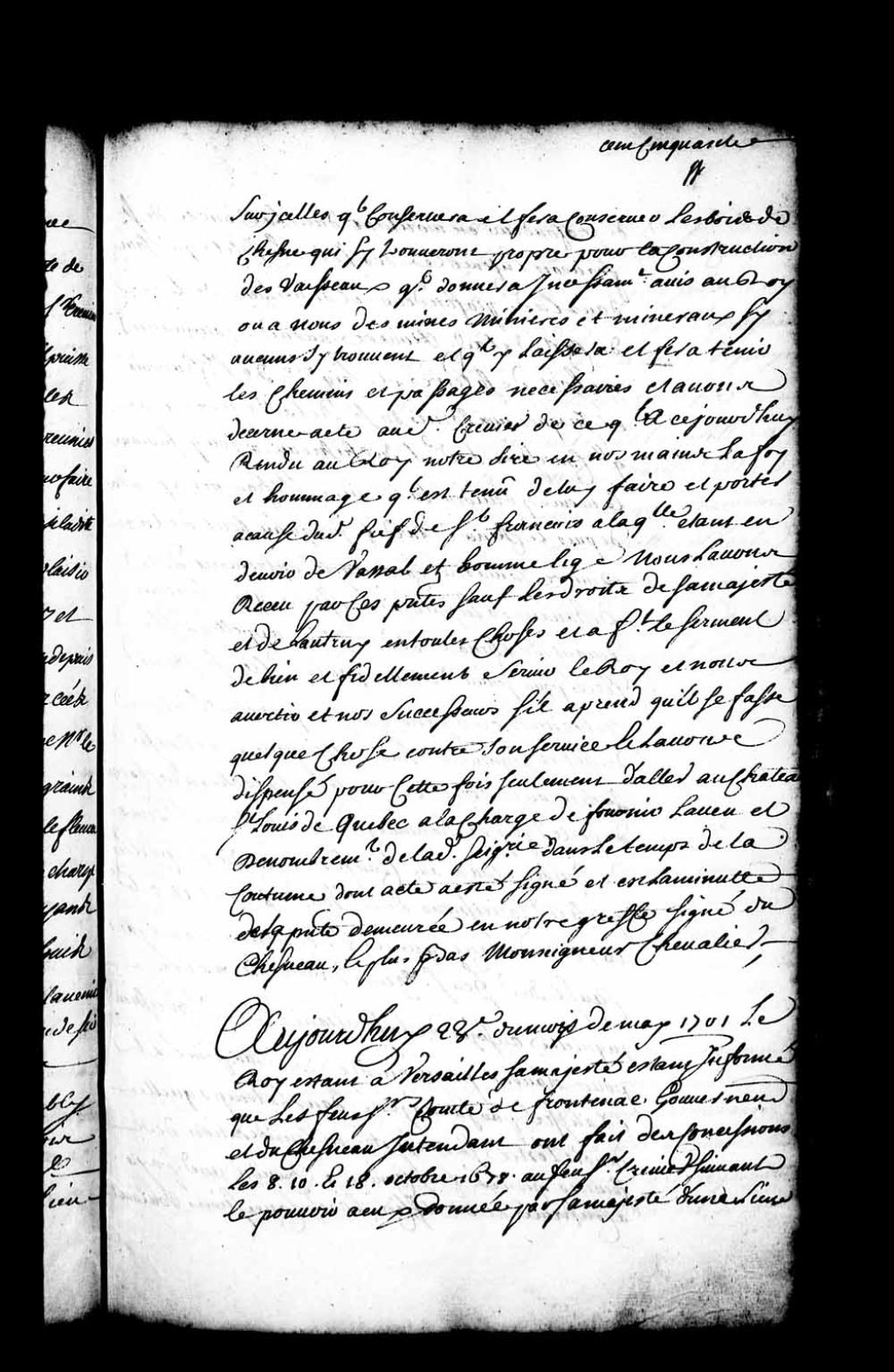 Brevet de confirmation par Sa Majesté de la concession faite au feu sieur Crevier d'une étendue de terre sur la rivière Saint-François, laquelle concession ayant été faite les 8, 10 et 18 octobre 1678 par messires de Frontenac et Duchesneau, gouverneur et intendant de la Nouvelle-France, 23 mai 1701, Archives nationales à Québec, Fonds Intendants, (03Q,E1,S4,SS1,D47,P3).