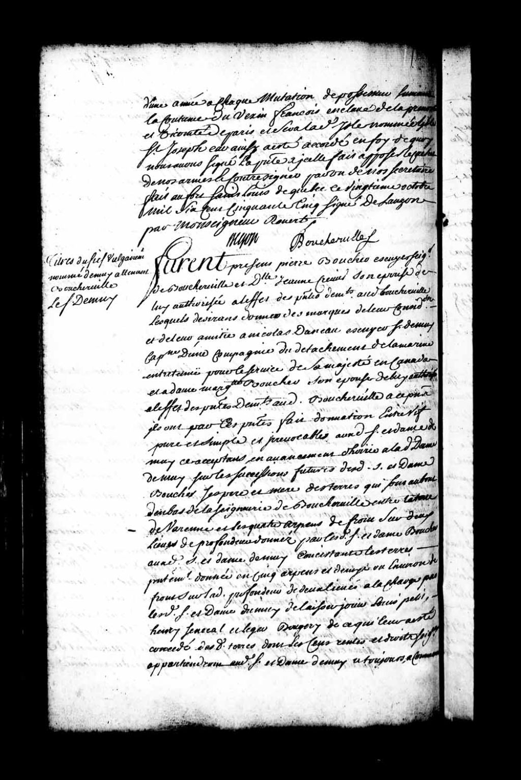 Projet de donation par Pierre Boucher, écuyer, seigneur de Boucherville, et son épouse, Jeanne Crevier, à Nicolas Daneau, sieur de Muy, et Marguerite Boucher, leurs gendre et fille, d'une certaine partie du fief et seigneurie de Boucherville (Notaire Antoine Adhémar dit Saint-Martin)