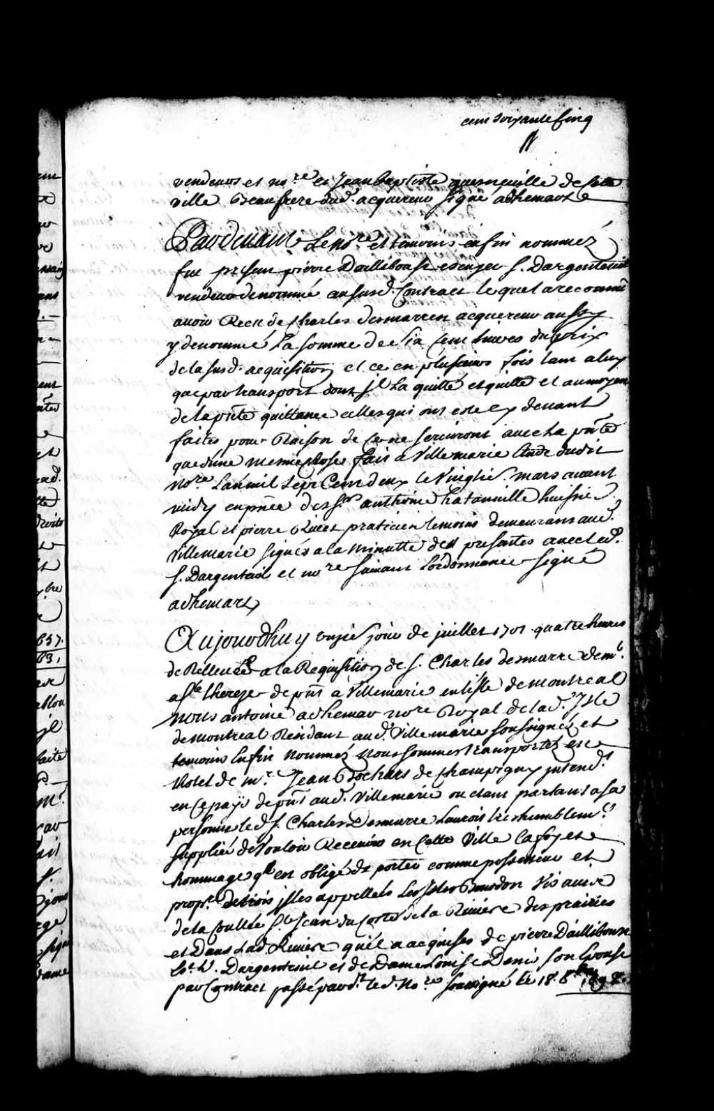 Acte de foi et hommage fait devant Jean Bochart Champigny, intendant en Nouvelle-France, par Charles Demarre (Desmares), demeurant à Sainte-Thérèse, pour trois îles appelées les îles Bourdon, situées vis-à-vis de la coulée Saint-Jean, du côté de la rivière des Prairies, et dans ladite rivière, lesquelles ayant été acquises de Pierre d'Ailleboust, sieur d'Argenteuil, et dame Louise Denys (Denis), son épouse, par contrat passé devant le notaire Antoine Adhémar dit Saint-Martin, le 18 octobre 1698, lesquelles îles ayant été acquises par ledit sieur d'Argenteuil de Charles d'Ailleboust de Musseaux et dame Catherine Le Gardeur (LeGardeur), son épouse, par contrat passé devant ledit notaire Adhémar, le 13 septembre 1693, lesdites îles ayant été concédées audit Charles d'Ailleboust de Musseaux au nom de Sa Majesté par monsieur de Lauzon, gouverneur, le 18 septembre 1657, et par monsieur Talon, intendant, le 27 juin 1668