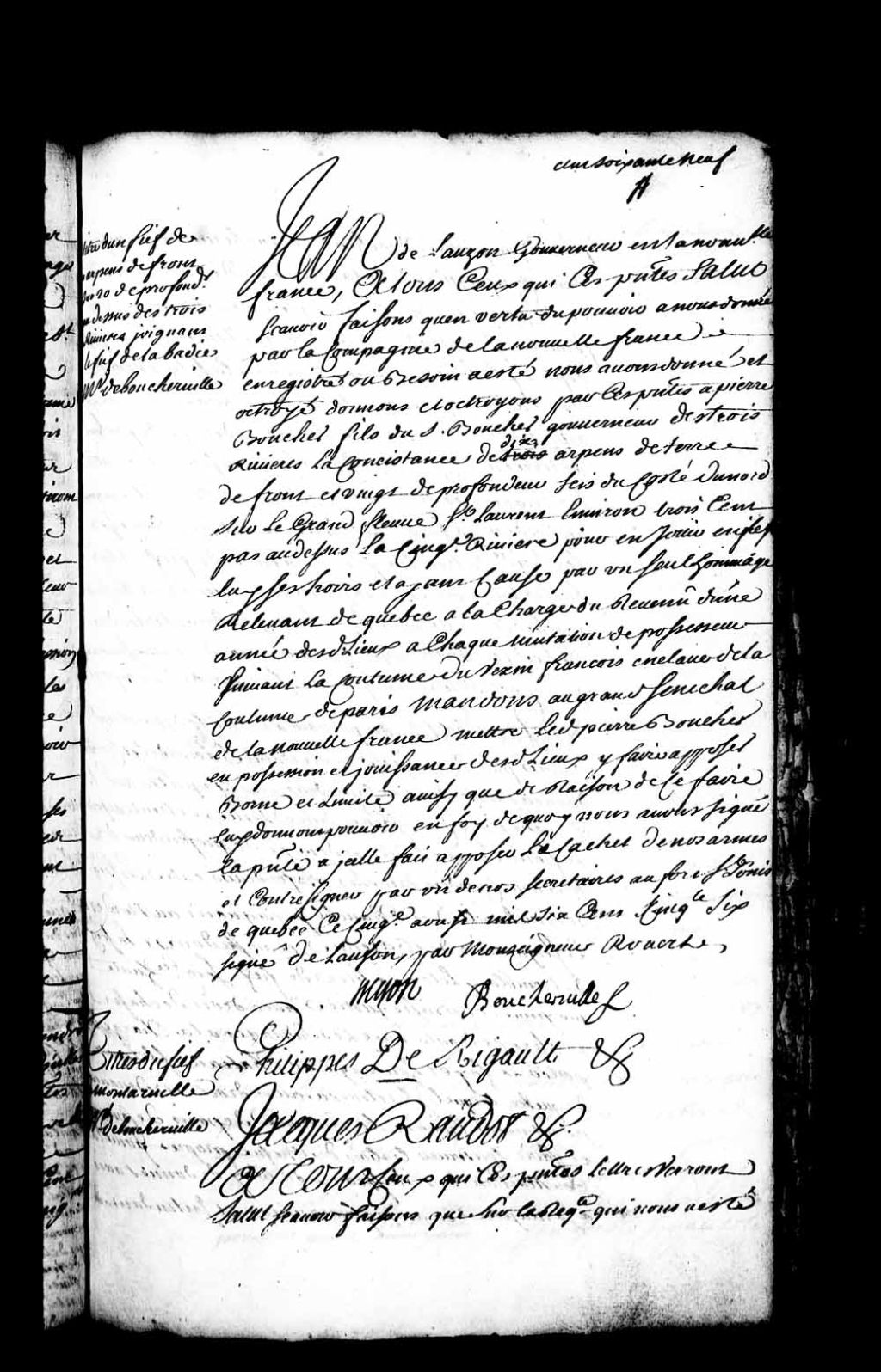 Acte de concession par Jean de Lauzon, au nom de la Compagnie de la Nouvelle-France, à Pierre Boucher, fils du sieur Boucher, gouverneur des Trois-Rivières, d'un fief de dix arpents de terre de front et vingt de profondeur, sur le grand fleuve Saint-Laurent du côté du nord, à environ trois cents pas au-dessus de la Cinquième rivière au lieu dit des Trois-Rivières, pour en jouir en titre de fief et seigneurie, 5 août 1656-08-05, Archives nationales à Québec, Fonds Intendants, (03Q,E1,S4,SS1,D58,P1).