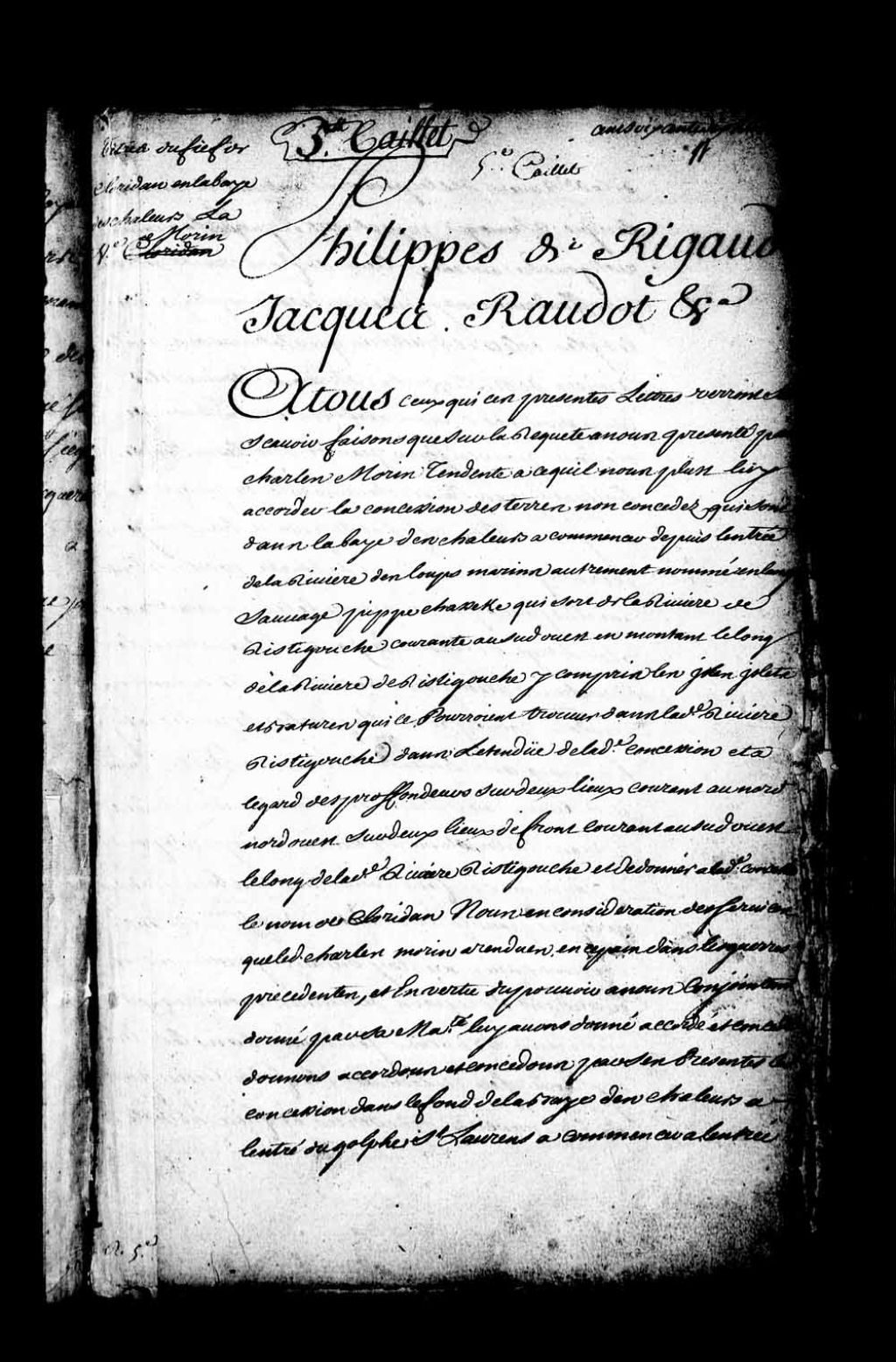 Acte de concession par Philippe de Rigaud, Marquis de Vaudreuil, gouverneur, et Jacques Raudot, intendant de la Nouvelle-France, à Charles Morin des terres non concédées dans le fond de la baie des Chaleurs, à commencer depuis l'entrée de la rivière des Loups Marins, autrement nommée en langue sauvage (amérindienne) Pippechassekec, qui sort à la rivière Ristigouche, laquelle concession courant au sud-ouest en montant le long de la rivière de Ristigouche et comprenant les îles, îlets et battures dans ladite rivière Ristigouche dans l'étendue de ladite concession, sur deux lieues de profondeur, courant au nord-nord-ouest, sur deux lieues de front, courant au sud-ouest le long de ladite rivière Ristigouche, ladite concession portant dorénavant le nom de Cloridan
