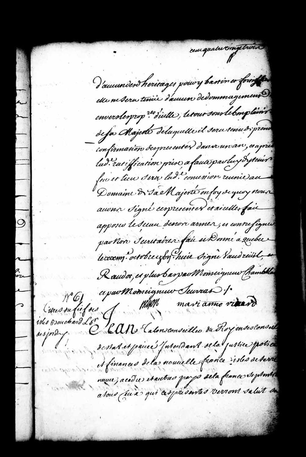 Acte de concession par Jean Talon, intendant de la Nouvelle-France, au sieur Fortel, frère du sieur de Bécancour, des îles nommées Bouchard, en titre de fief et seigneurie à la charge d'y faire tenir feu et lieu et des droits et redevances accoutumés selon la coutume de la Prévôté et vicomté de Paris